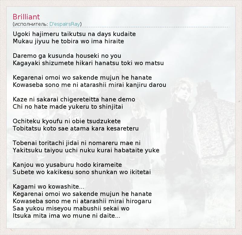 Это интересно:D’espairsRay - одна из первых вижуал кей групп, порадовавших своим приездом зарубежных фанатов. С тех пор они неоднократно выступали в Европе и Северной Америке.Тяжелый индастриал метал (первый альбом в частности), прекрасно звучит вместе с замечательным голосом HIZUMI, способного исполнять как гроулинг и скрим, так и красивейшие мелодии. Их внешний вид... продолжение
