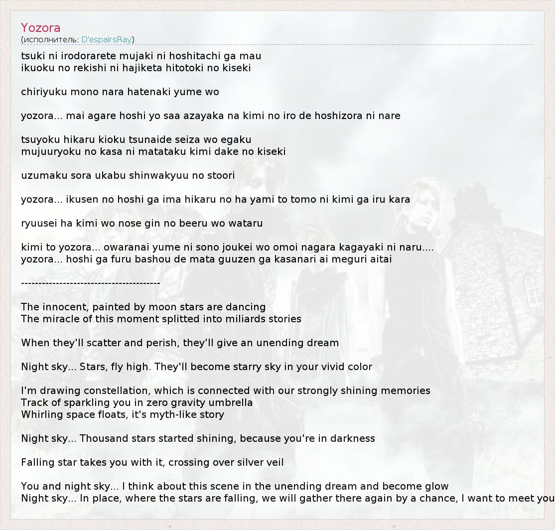tsuki ni irodorarete mujaki ni hoshitachi ga mau ikuoku no rekishi ni hajiketa hitotoki no kiseki chiriyuku mono nara hatenaki yume wo yozora... mai agare hoshi yo saa azayaka na kimi no iro de hoshizora ni nare tsuyoku hikaru kioku tsunaide seiza wo egaku mujuuryoku no kasa ni matataku kimi dake no kiseki uzumaku sora ukabu shinwakyuu no stoori yozora... ikusen no hoshi ga ima hikaru no ha yami to tomo ni kimi ga iru kara ryuusei ha kimi wo nose gin no beeru wo wataru kimi to yozora... owaranai yume ni sono joukei wo omoi nagara kagayaki ni naru.... yozora... hoshi ga furu bashou de mata guuzen ga kasanari ai meguri aitai ---------------------------------------- The innocent, painted by moon stars are dancing The miracle of this moment splitted into miliards stories When they'll scatter and perish, they'll give an unending dream Night sky... Stars, fly high. They'll become starry sky in your vivid color I'm drawing constellation, which is connected with our strongly shining memories Track of sparkling you in zero gravity umbrella Whirling space floats, it's myth-like story Night sky... Thousand stars started shining, because you're in darkness Falling star takes you with it, crossing over silver veil You and night sky... I think about this scene in the unending dream and become glow Night sky... In place, where the stars are falling, we will gather there again by a chance, I want to meet you