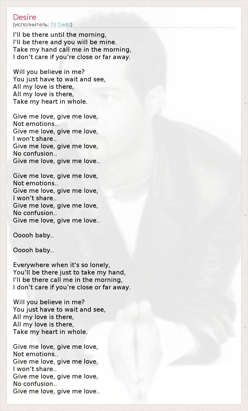 Я буду здесь до утра, Я буду здесь, и ты будешь моим. Возьми мою руку, позови меня средь утра, Мне неважно, близко ты или далеко. Будешь ли ты верить мне? Ты просто должен подождать и увидишь, Что вся моя любовь здесь, Вся моя любовь здесь, Возьми моё сердце полностью. Дай мне любовь, дай любовь, Не эмоции.. Дай мне любовь, дай любовь, Я не поделюсь.. Дай мне любовь, дай любовь, Без смущения.. Дай мне любовь, дай любовь.. Дай мне любовь, дай любовь, Не эмоции.. Дай мне любовь, дай любовь, Я не поделюсь.. Дай мне любовь, дай любовь, Без смущения.. Дай мне любовь, дай любовь.. Уууу малыш.. Уууу малыш.. Везде, где будет одиноко, Ты будешь рядом, чтобы взять меня за руку, Я буду там, позови меня средь утра, Мне неважно, близко ты или далеко. Будешь ли ты верить мне? Ты просто должен подождать и увидишь, Что вся моя любовь здесь, Вся моя любовь здесь, Возьми моё сердце полностью. Дай мне любовь, дай любовь, Не эмоции.. Дай мне любовь, дай любовь, Я не поделюсь.. Дай мне любовь, дай любовь, Без смущения.. Дай мне любовь, дай любовь..