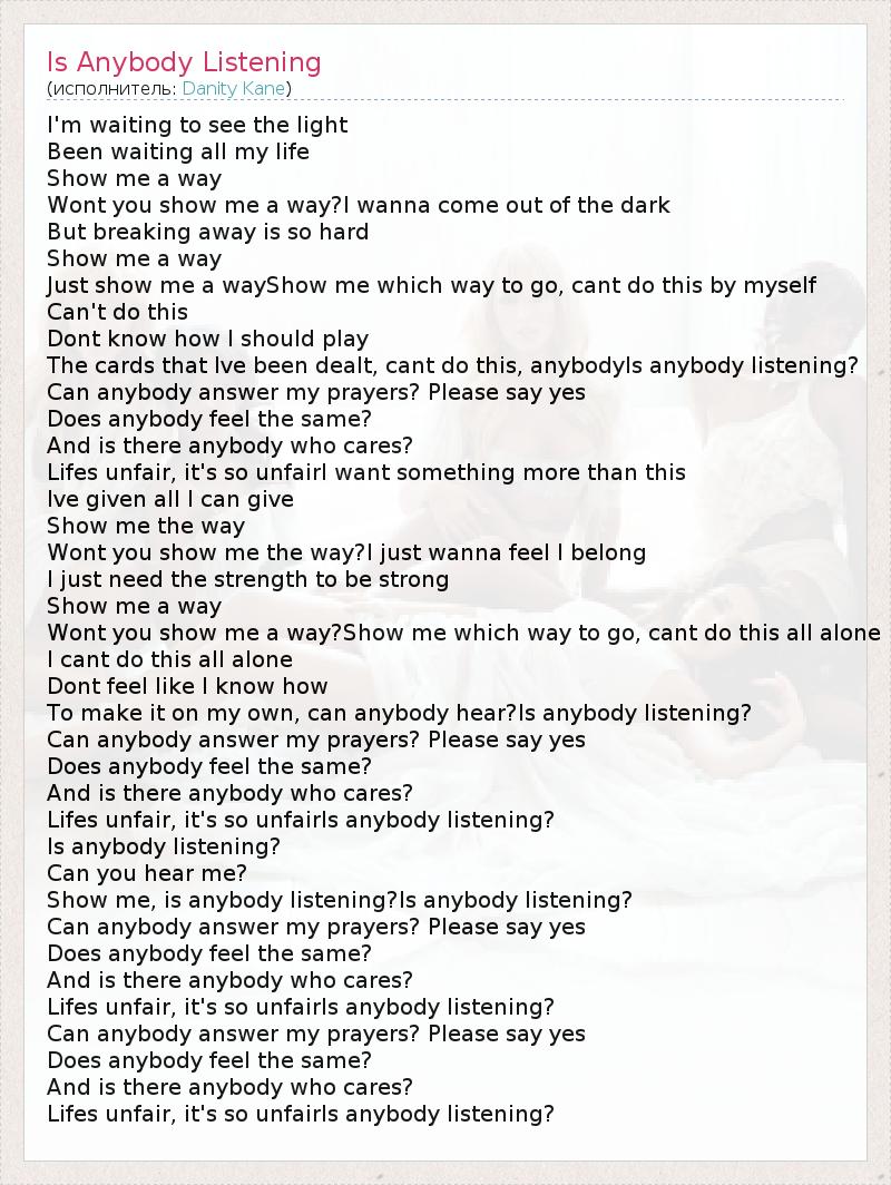I'm waiting to see the light Been waiting all my life Show me a way Wont you show me a way?I wanna come out of the dark But breaking away is so hard Show me a way Just show me a wayShow me which way to go, cant do this by myself Can't do this Dont know how I should play The cards that Ive been dealt, cant do this, anybodyIs anybody listening? Can anybody answer my prayers? Please say yes Does anybody feel the same? And is there anybody who cares? Lifes unfair, it's so unfairI want something more than this Ive given all I can give Show me the way Wont you show me the way?I just wanna feel I belong I just need the strength to be strong Show me a way Wont you show me a way?Show me which way to go, cant do this all alone I cant do this all alone Dont feel like I know how To make it on my own, can anybody hear?Is anybody listening? Can anybody answer my prayers? Please say yes Does anybody feel the same? And is there anybody who cares? Lifes unfair, it's so unfairIs anybody listening? Is anybody listening? Can you hear me? Show me, is anybody listening?Is anybody listening? Can anybody answer my prayers? Please say yes Does anybody feel the same? And is there anybody who cares? Lifes unfair, it's so unfairIs anybody listening? Can anybody answer my prayers? Please say yes Does anybody feel the same? And is there anybody who cares? Lifes unfair, it's so unfairIs anybody listening?