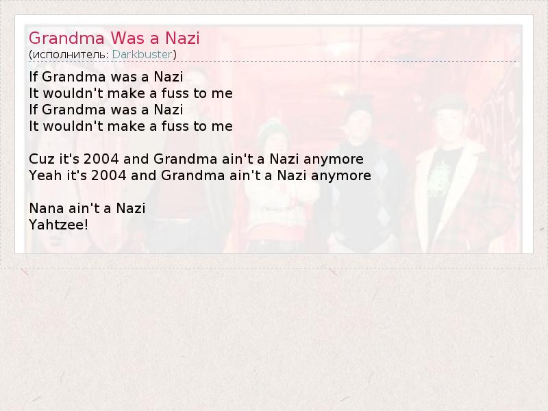 А как ты думаешь, о чем песня "Grandma Was a Nazi" ?