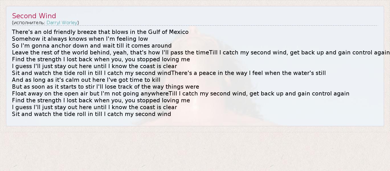 Sit and watch the tide roll in till I catch my second windThere's a peace in the way I feel when the water's still