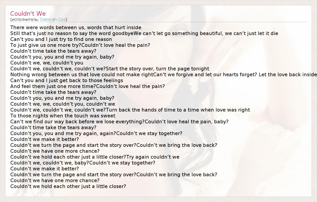 There were words between us, words that hurt inside Still that's just no reason to say the word goodbyeWe can't let go something beautiful, we can't just let it die Can't you and I just try to find one reason To just give us one more try?Couldn't love heal the pain? Couldn't time take the tears away? Couldn't you, you and me try again, baby? Couldn't we, we, couldn't you Couldn't we, couldn't we, couldn't we?Start the story over, turn the page tonight Nothing wrong between us that love could not make rightCan't we forgive and let our hearts forget? Let the love back inside Can't you and I just get back to those feelings And feel them just one more time?Couldn't love heal the pain? Couldn't time take the tears away? Couldn't you, you and me try again, baby? Couldn't we, we, couldn't you, couldn't we Couldn't we, couldn't we, couldn't we?Turn back the hands of time to a time when love was right To those nights when the touch was sweet Can't we find our way back before we lose everything?Couldn't love heal the pain, baby? Couldn't time take the tears away? Couldn't you, you and me try again, again?Couldn't we stay together? Couldn't we make it better? Couldn't we turn the page and start the story over?Couldn't we bring the love back? Couldn't we have one more chance? Couldn't we hold each other just a little closer?Try again couldn't we Couldn't we, couldn't we, baby?Couldn't we stay together? Couldn't we make it better? Couldn't we turn the page and start the story over?Couldn't we bring the love back? Couldn't we have one more chance? Couldn't we hold each other just a little closer?