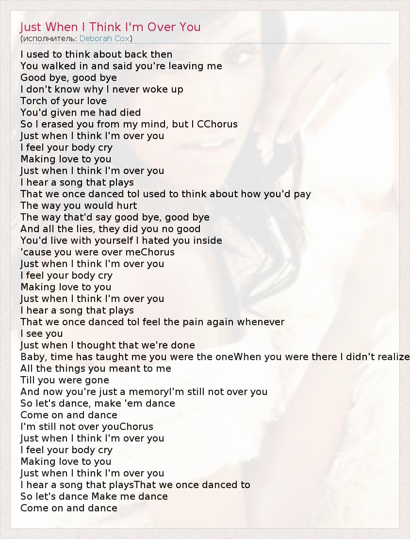 I used to think about back then You walked in and said you're leaving me Good bye, good bye I don't know why I never woke up Torch of your love You'd given me had died So I erased you from my mind, but I CChorus Just when I think I'm over you I feel your body cry Making love to you Just when I think I'm over you I hear a song that plays That we once danced toI used to think about how you'd pay The way you would hurt The way that'd say good bye, good bye And all the lies, they did you no good You'd live with yourself I hated you inside 'cause you were over meChorus Just when I think I'm over you I feel your body cry Making love to you Just when I think I'm over you I hear a song that plays That we once danced toI feel the pain again whenever I see you Just when I thought that we're done Baby, time has taught me you were the oneWhen you were there I didn't realize All the things you meant to me Till you were gone And now you're just a memoryI'm still not over you So let's dance, make 'em dance Come on and dance I'm still not over youChorus Just when I think I'm over you I feel your body cry Making love to you Just when I think I'm over you I hear a song that playsThat we once danced to So let's dance Make me dance Come on and dance