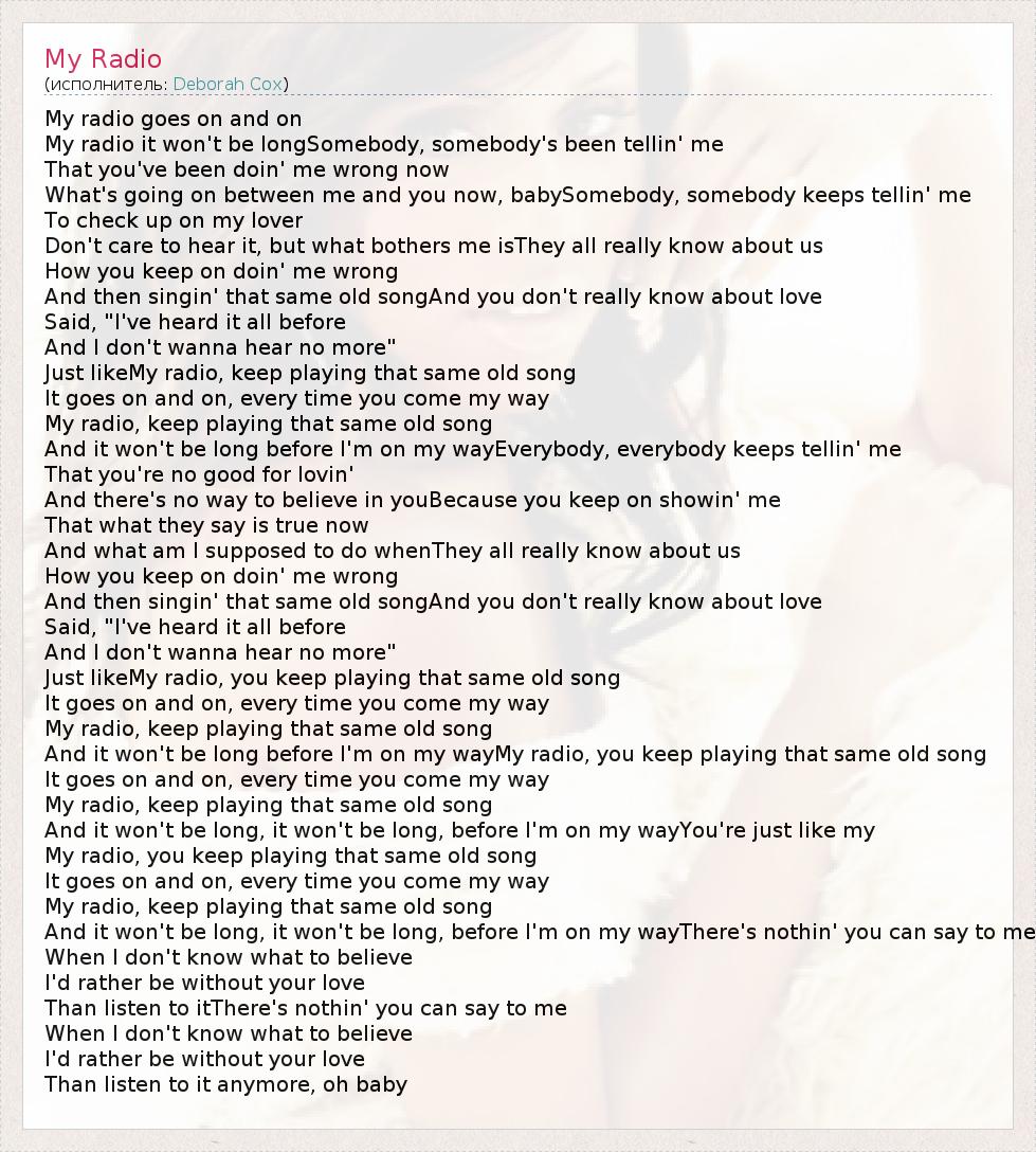 And it won't be long before I'm on my wayMy radio, you keep playing that same old song