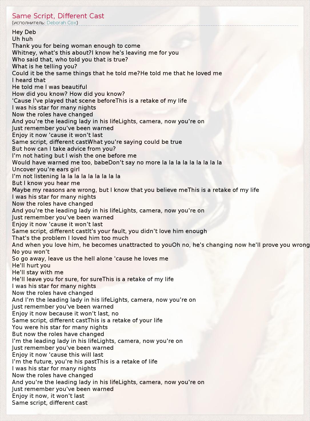 ГлавнаяИсполнителиDeborah CoxSame Script, Different Cast