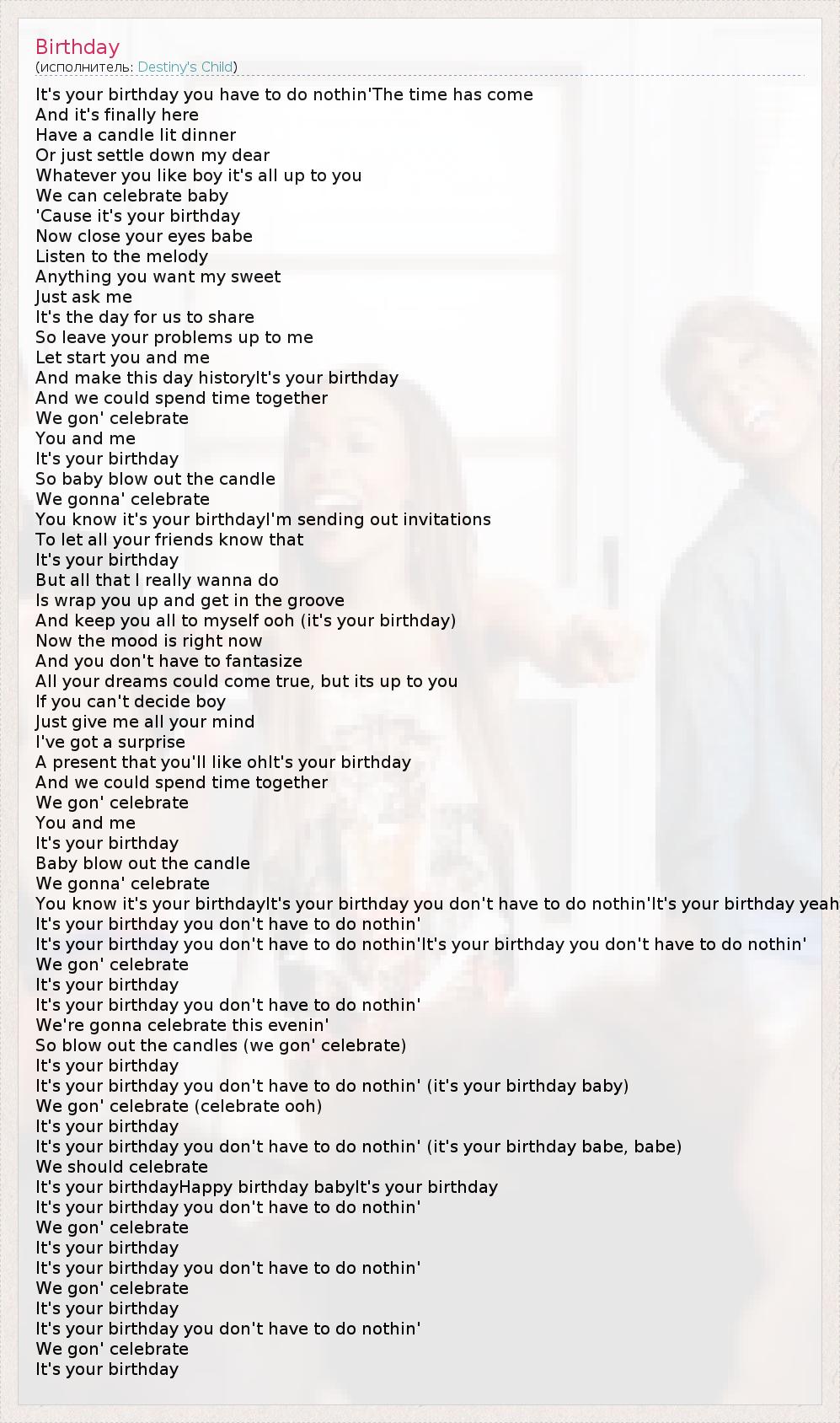 It's your birthday you have to do nothin'The time has come And it's finally here Have a candle lit dinner Or just settle down my dear Whatever you like boy it's all up to you We can celebrate baby 'Cause it's your birthday Now close your eyes babe Listen to the melody Anything you want my sweet Just ask me It's the day for us to share So leave your problems up to me Let start you and me And make this day historyIt's your birthday And we could spend time together We gon' celebrate You and me It's your birthday So baby blow out the candle We gonna' celebrate You know it's your birthdayI'm sending out invitations To let all your friends know that It's your birthday But all that I really wanna do Is wrap you up and get in the groove And keep you all to myself ooh (it's your birthday) Now the mood is right now And you don't have to fantasize All your dreams could come true, but its up to you If you can't decide boy Just give me all your mind I've got a surprise A present that you'll like ohIt's your birthday And we could spend time together We gon' celebrate You and me It's your birthday Baby blow out the candle We gonna' celebrate You know it's your birthdayIt's your birthday you don't have to do nothin'It's your birthday yeah It's your birthday you don't have to do nothin' It's your birthday you don't have to do nothin'It's your birthday you don't have to do nothin' We gon' celebrate It's your birthday It's your birthday you don't have to do nothin' We're gonna celebrate this evenin' So blow out the candles (we gon' celebrate) It's your birthday It's your birthday you don't have to do nothin' (it's your birthday baby) We gon' celebrate (celebrate ooh) It's your birthday It's your birthday you don't have to do nothin' (it's your birthday babe, babe) We should celebrate It's your birthdayHappy birthday babyIt's your birthday It's your birthday you don't have to do nothin' We gon' celebrate It's your birthday It's your birthday you don't have to do nothin' We gon' celebrate It's your birthday It's your birthday you don't have to do nothin' We gon' celebrate It's your birthday