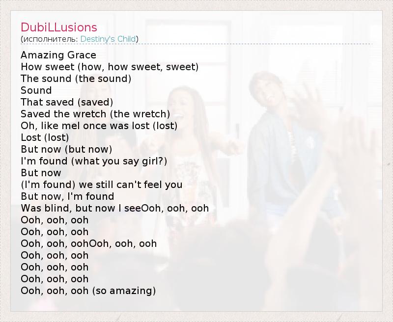 Amazing Grace How sweet (how, how sweet, sweet) The sound (the sound) Sound That saved (saved) Saved the wretch (the wretch) Oh, like meI once was lost (lost) Lost (lost) But now (but now) I'm found (what you say girl?) But now (I'm found) we still can't feel you But now, I'm found Was blind, but now I seeOoh, ooh, ooh Ooh, ooh, ooh Ooh, ooh, ooh Ooh, ooh, oohOoh, ooh, ooh Ooh, ooh, ooh Ooh, ooh, ooh Ooh, ooh, ooh Ooh, ooh, ooh (so amazing)