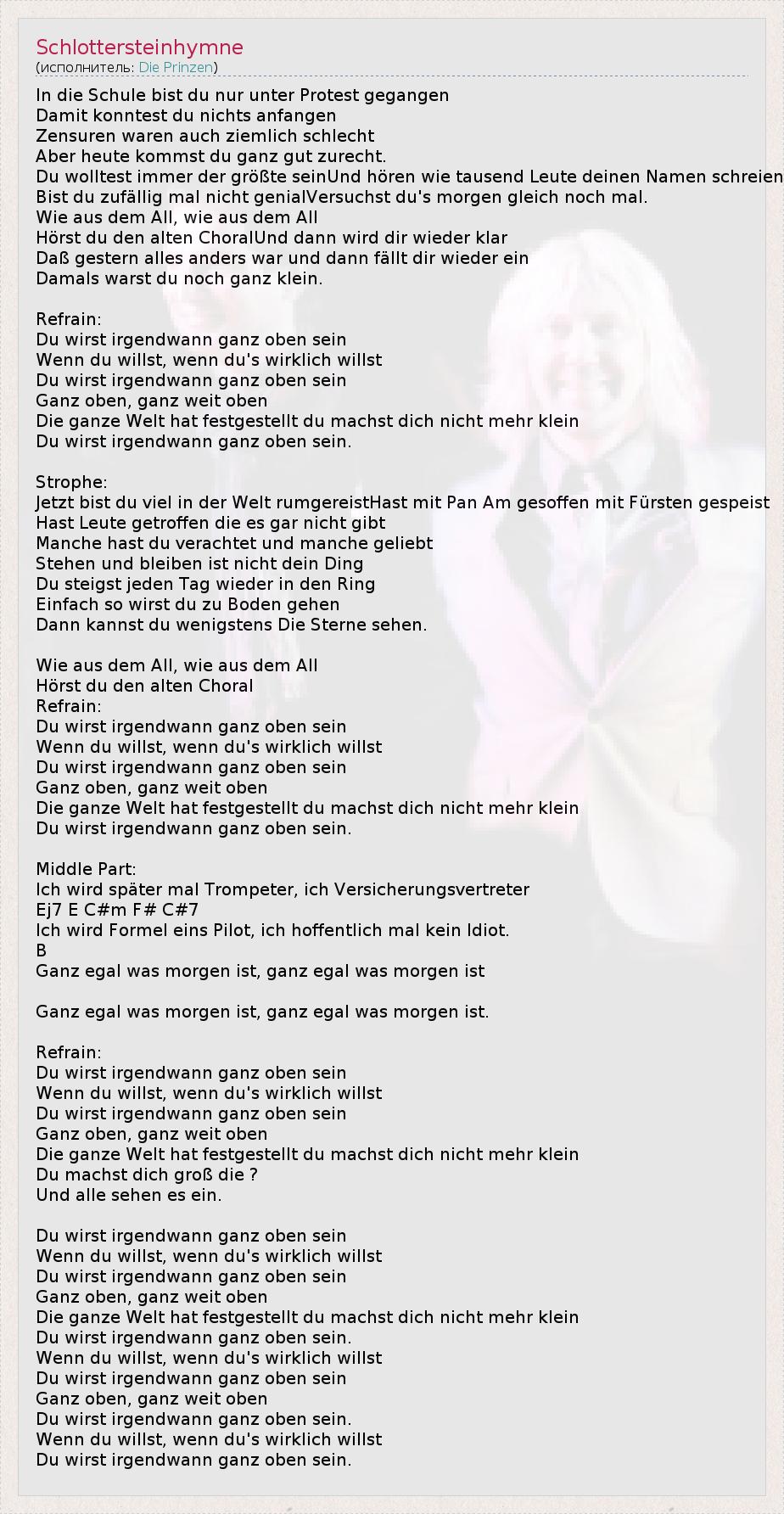 In die Schule bist du nur unter Protest gegangen Damit konntest du nichts anfangen Zensuren waren auch ziemlich schlecht Aber heute kommst du ganz gut zurecht. Du wolltest immer der größte seinUnd hören wie tausend Leute deinen Namen schreien Bist du zufällig mal nicht genialVersuchst du's morgen gleich noch mal. Wie aus dem All, wie aus dem All Hörst du den alten ChoralUnd dann wird dir wieder klar Daß gestern alles anders war und dann fällt dir wieder ein Damals warst du noch ganz klein. Refrain: Du wirst irgendwann ganz oben sein Wenn du willst, wenn du's wirklich willst Du wirst irgendwann ganz oben sein Ganz oben, ganz weit oben Die ganze Welt hat festgestellt du machst dich nicht mehr klein Du wirst irgendwann ganz oben sein. Strophe: Jetzt bist du viel in der Welt rumgereistHast mit Pan Am gesoffen mit Fürsten gespeist Hast Leute getroffen die es gar nicht gibt Manche hast du verachtet und manche geliebt Stehen und bleiben ist nicht dein Ding Du steigst jeden Tag wieder in den Ring Einfach so wirst du zu Boden gehen Dann kannst du wenigstens Die Sterne sehen. Wie aus dem All, wie aus dem All Hörst du den alten Choral Refrain: Du wirst irgendwann ganz oben sein Wenn du willst, wenn du's wirklich willst Du wirst irgendwann ganz oben sein Ganz oben, ganz weit oben Die ganze Welt hat festgestellt du machst dich nicht mehr klein Du wirst irgendwann ganz oben sein. Middle Part: Ich wird später mal Trompeter, ich Versicherungsvertreter Ej7 E C#m F# C#7 Ich wird Formel eins Pilot, ich hoffentlich mal kein Idiot. B Ganz egal was morgen ist, ganz egal was morgen ist Ganz egal was morgen ist, ganz egal was morgen ist. Refrain: Du wirst irgendwann ganz oben sein Wenn du willst, wenn du's wirklich willst Du wirst irgendwann ganz oben sein Ganz oben, ganz weit oben Die ganze Welt hat festgestellt du machst dich nicht mehr klein Du machst dich groß die ? Und alle sehen es ein. Du wirst irgendwann ganz oben sein Wenn du willst, wenn du's wirklich willst Du wirst irgendwann ganz oben sein Ganz oben, ganz weit oben Die ganze Welt hat festgestellt du machst dich nicht mehr klein Du wirst irgendwann ganz oben sein. Wenn du willst, wenn du's wirklich willst Du wirst irgendwann ganz oben sein Ganz oben, ganz weit oben Du wirst irgendwann ganz oben sein. Wenn du willst, wenn du's wirklich willst Du wirst irgendwann ganz oben sein.