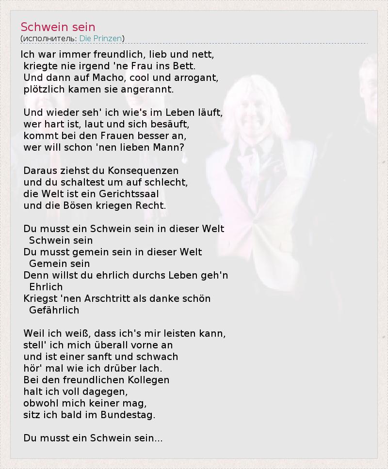 Я был всегда дружелюбным, милым, и славным, И никогда не мог затащить женщину в постель. И когда я переключился на мачо, холодного и высокомерного, Внезапно они стали бегать за мной. Я снова понял, как устроена эта жизнь. Грубый, шумный и много пьющий парень, Более притягателен для женщин. Кому, правда, нужен хороший парень? Так что делайте выводы и переключаетесь на плохого. Мир - зал суда и плохих парней считают правыми. Ты должен быть свиньей в этом мире Будь свиньей Ты должен чего-то стоить в этом мире Будь стоящим Ведь если ты захочешь прожить жизнь честно Честно Ты получишь пинок под зад за спасибо Опасный Я знаю, что мне всё сойдет с рук, Поэтому повсюду лезу на передний план и если кто-то мягок и слаб просто послушай, как я смеюсь над тобой Со своими дружелюбными коллегами Я поступаю противоположно. Несмотря на то, что я никому не нравлюсь, Я скоро буду в федеральном собрании Ты должен быть свиньей ...