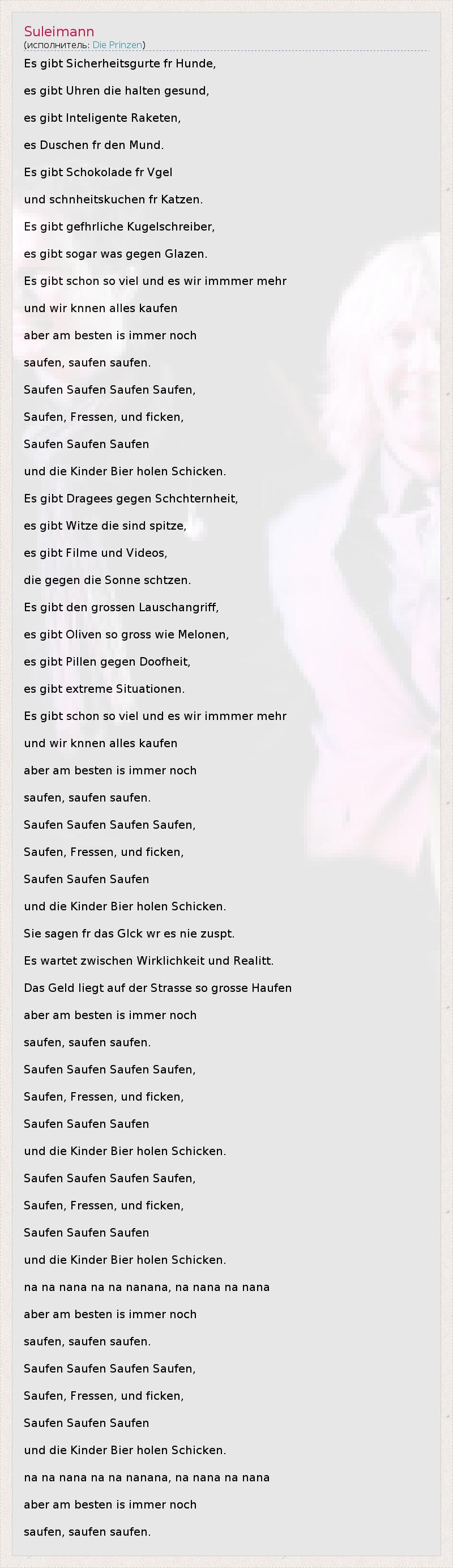 Это интересно:Die Prinzen sind eine aus Leipzig stammende deutsche Musikgruppe. Ihre bekanntesten Songs sind (Du musst ein) Schwein sein, Küssen verboten, Alles nur geklaut, Millionär, Gabi und Klaus, Mein Fahrrad, So viel Spaß für wenig Geld (Ich freu mich) und Deutschland.Die Mitglieder erhielten ihre Gesangsausbildung beim Thomanerchor Leipzig und dem Dresdner Kreuzchor. 1987 begannen sie ihre Karriere als Die Herzbuben in der DDR. Wegen einer Verwechslung mit den Wildecker Herzbuben benannten sie sich 1991 in Die Prinzen um. Gleich darauf hatten sie ihren Durchbruch mit ihrem ersten Hit Gabi und Klaus. Im selben Jahr brachten sie ihr erstes Album Das Leben ist grausam heraus und gingen mit Udo Lindenberg... продолжение
