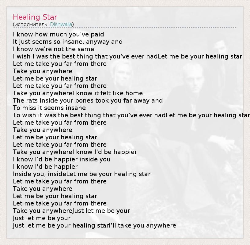 I know how much you've paid It just seems so insane, anyway and I know we're not the same I wish I was the best thing that you've ever hadLet me be your healing star Let me take you far from there Take you anywhere Let me be your healing star Let me take you far from there Take you anywhereI know it felt like home The rats inside your bones took you far away and To miss it seems insane To wish it was the best thing that you've ever hadLet me be your healing star Let me take you far from there Take you anywhere Let me be your healing star Let me take you far from there Take you anywhereI know I'd be happier I know I'd be happier inside you I know I'd be happier Inside you, insideLet me be your healing star Let me take you far from there Take you anywhere Let me be your healing star Let me take you far from there Take you anywhereJust let me be your Just let me be your Just let me be your healing starI'll take you anywhere