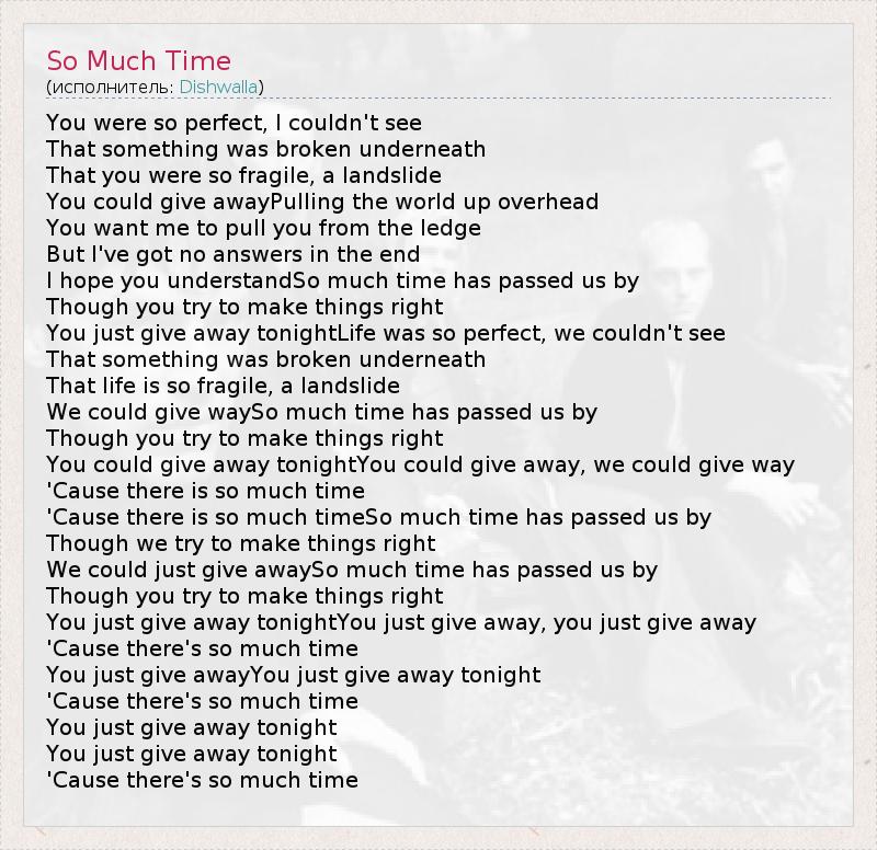 You were so perfect, I couldn't see That something was broken underneath That you were so fragile, a landslide You could give awayPulling the world up overhead You want me to pull you from the ledge But I've got no answers in the end I hope you understandSo much time has passed us by Though you try to make things right You just give away tonightLife was so perfect, we couldn't see That something was broken underneath That life is so fragile, a landslide We could give waySo much time has passed us by Though you try to make things right You could give away tonightYou could give away, we could give way 'Cause there is so much time 'Cause there is so much timeSo much time has passed us by Though we try to make things right We could just give awaySo much time has passed us by Though you try to make things right You just give away tonightYou just give away, you just give away 'Cause there's so much time You just give awayYou just give away tonight 'Cause there's so much time You just give away tonight You just give away tonight 'Cause there's so much time