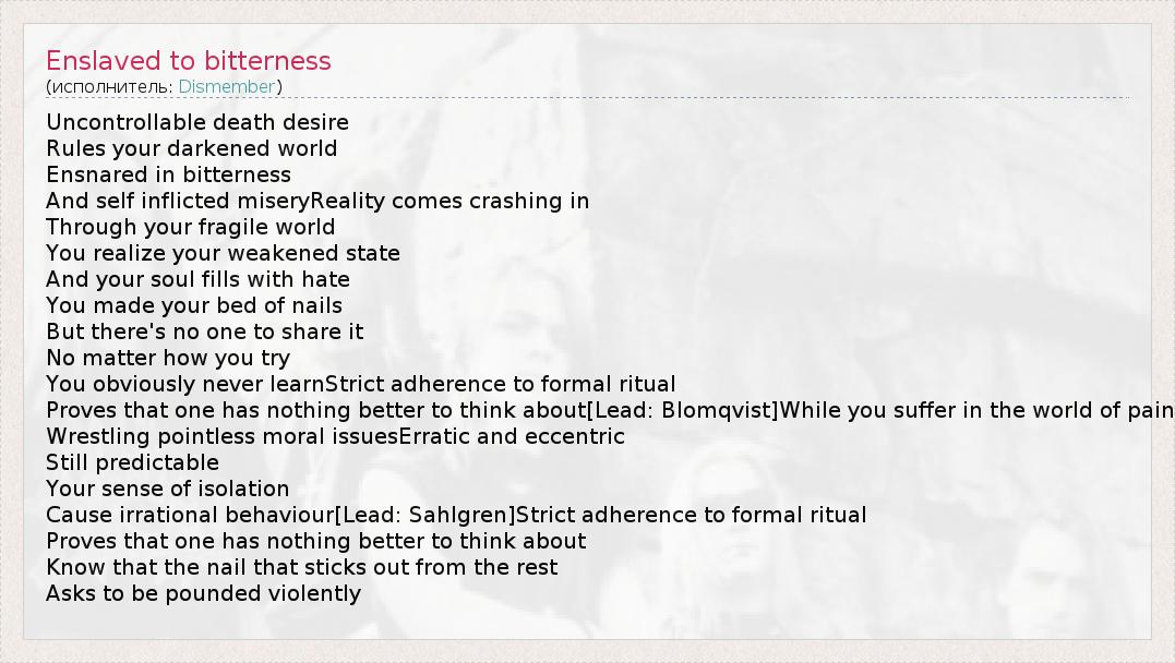 А как ты думаешь, о чем песня "Enslaved to bitterness" ?