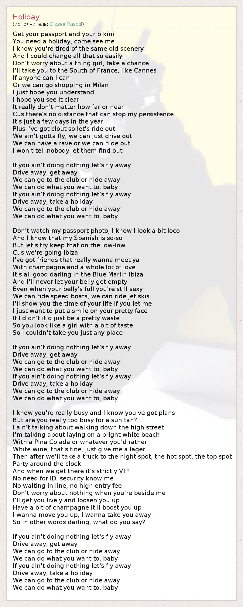 Get your passport and your bikini You need a holiday, come see me I know you're tired of the same old scenery And I could change all that so easily Don't worry about a thing girl, take a chance I'll take you to the South of France, like Cannes If anyone can I can Or we can go shopping in Milan I just hope you understand I hope you see it clear It really don't matter how far or near Cus there's no distance that can stop my persistence It's just a few days in the year Plus I've got clout so let's ride out We ain't gotta fly, we can just drive out We can have a rave or we can hide out I won't tell nobody let them find out If you ain't doing nothing let's fly away Drive away, get away We can go to the club or hide away We can do what you want to, baby If you ain't doing nothing let's fly away Drive away, take a holiday We can go to the club or hide away We can do what you want to, baby Don't watch my passport photo, I know I look a bit loco And I know that my Spanish is so-so But let's try keep that on the low-low Cus we're going Ibiza I've got friends that really wanna meet ya With champagne and a whole lot of love It's all good darling in the Blue Marlin Ibiza And I'll never let your belly get empty Even when your belly's full you're still sexy We can ride speed boats, we can ride jet skis I'll show you the time of your life if you let me I just want to put a smile on your pretty face If I didn't it'd just be a pretty waste So you look like a girl with a bit of taste So I couldn't take you just any place If you ain't doing nothing let's fly away Drive away, get away We can go to the club or hide away We can do what you want to, baby If you ain't doing nothing let's fly away Drive away, take a holiday We can go to the club or hide away We can do what you want to, baby I know you're really busy and I know you've got plans But are you really too busy for a sun tan? I ain't talking about walking down the high street I'm talking about laying on a bright white beach With a Pina Colada or whatever you'd rather White wine, that's fine, just give me a lager Then after we'll take a truck to the night spot, the hot spot, the top spot Party around the clock And when we get there it's strictly VIP No need for ID, security know me No waiting in line, no high entry fee Don't worry about nothing when you're beside me I'll get you lively and loosen you up Have a bit of champagne it'll boost you up I wanna move you up, I wanna take you away So in other words darling, what do you say? If you ain't doing nothing let's fly away Drive away, get away We can go to the club or hide away We can do what you want to, baby If you ain't doing nothing let's fly away Drive away, take a holiday We can go to the club or hide away We can do what you want to, baby