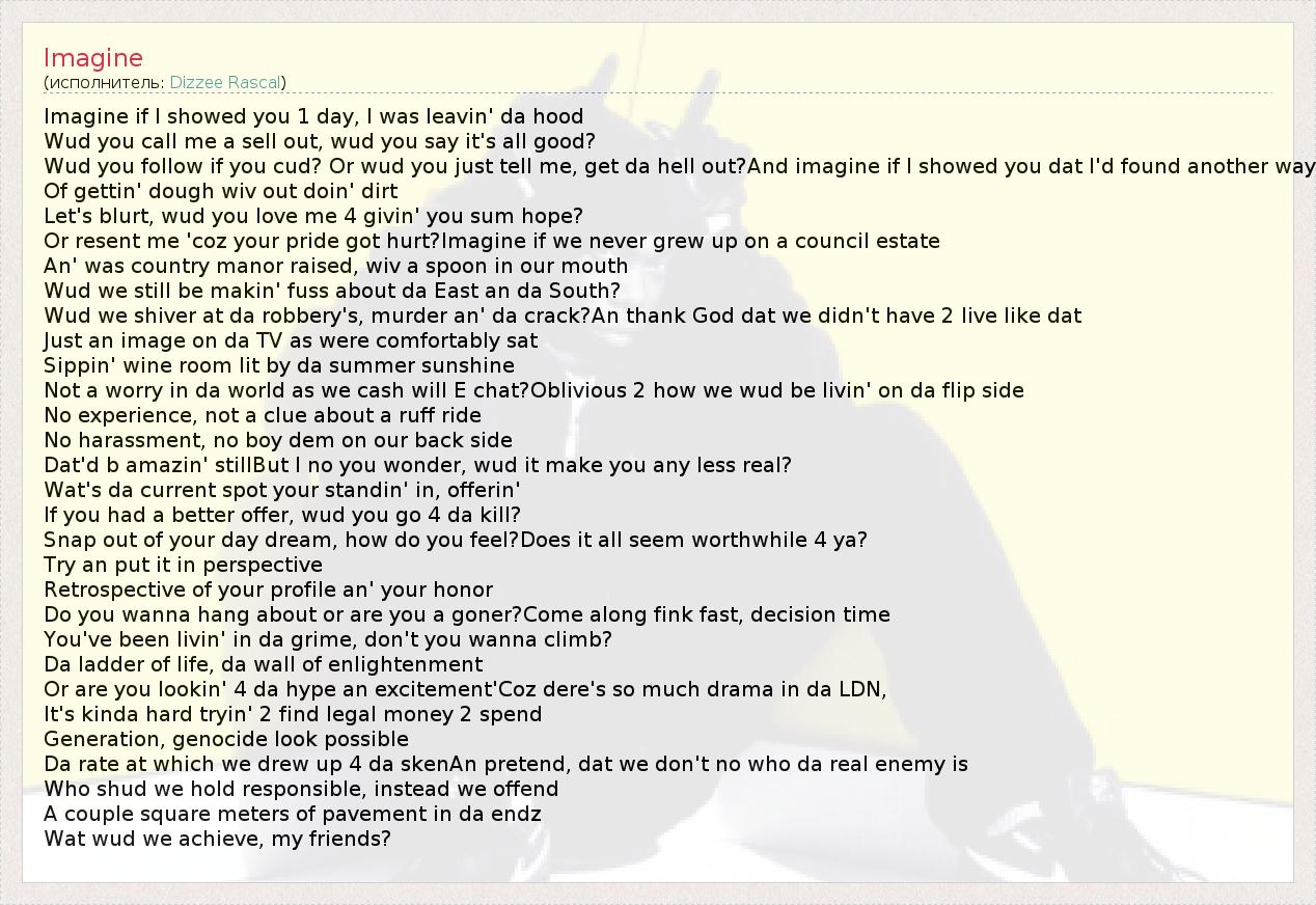 Imagine if I showed you 1 day, I was leavin' da hood Wud you call me a sell out, wud you say it's all good? Wud you follow if you cud? Or wud you just tell me, get da hell out?And imagine if I showed you dat I'd found another way Of gettin' dough wiv out doin' dirt Let's blurt, wud you love me 4 givin' you sum hope? Or resent me 'coz your pride got hurt?Imagine if we never grew up on a council estate An' was country manor raised, wiv a spoon in our mouth Wud we still be makin' fuss about da East an da South? Wud we shiver at da robbery's, murder an' da crack?An thank God dat we didn't have 2 live like dat Just an image on da TV as were comfortably sat Sippin' wine room lit by da summer sunshine Not a worry in da world as we cash will E chat?Oblivious 2 how we wud be livin' on da flip side No experience, not a clue about a ruff ride No harassment, no boy dem on our back side Dat'd b amazin' stillBut I no you wonder, wud it make you any less real? Wat's da current spot your standin' in, offerin' If you had a better offer, wud you go 4 da kill? Snap out of your day dream, how do you feel?Does it all seem worthwhile 4 ya? Try an put it in perspective Retrospective of your profile an' your honor Do you wanna hang about or are you a goner?Come along fink fast, decision time You've been livin' in da grime, don't you wanna climb? Da ladder of life, da wall of enlightenment Or are you lookin' 4 da hype an excitement'Coz dere's so much drama in da LDN, It's kinda hard tryin' 2 find legal money 2 spend Generation, genocide look possible Da rate at which we drew up 4 da skenAn pretend, dat we don't no who da real enemy is Who shud we hold responsible, instead we offend A couple square meters of pavement in da endz Wat wud we achieve, my friends?
