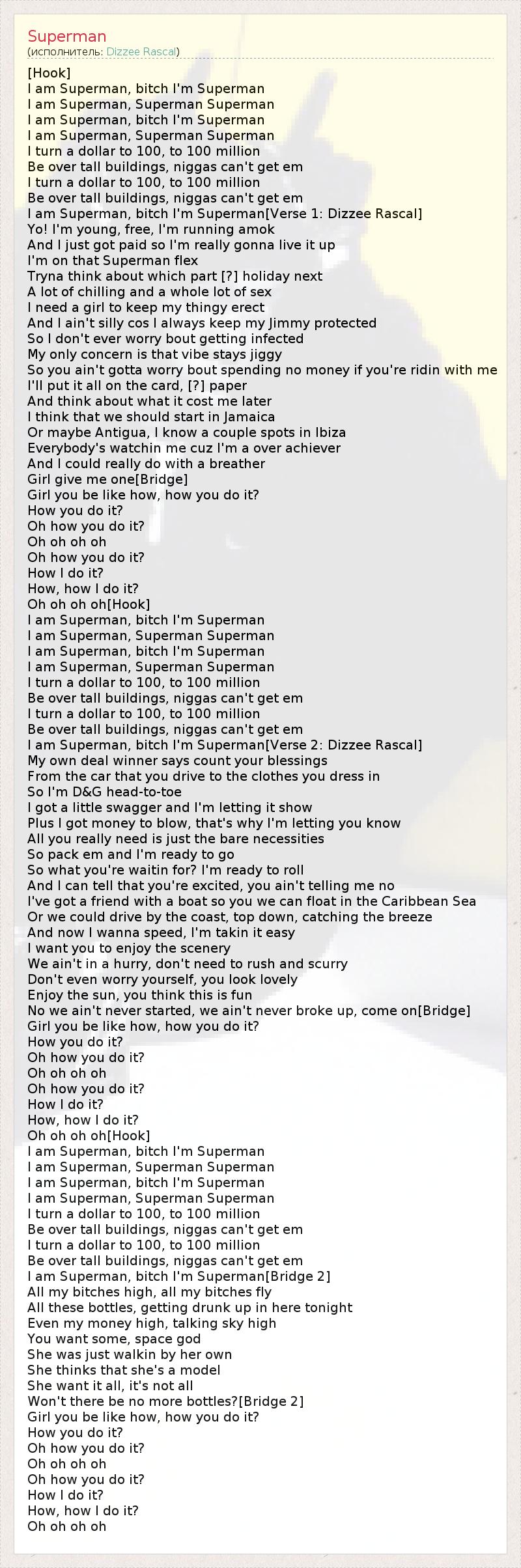 [Hook] I am Superman, bitch I'm Superman I am Superman, Superman Superman I am Superman, bitch I'm Superman I am Superman, Superman Superman I turn a dollar to 100, to 100 million Be over tall buildings, niggas can't get em I turn a dollar to 100, to 100 million Be over tall buildings, niggas can't get em I am Superman, bitch I'm Superman[Verse 1: Dizzee Rascal] Yo! I'm young, free, I'm running amok And I just got paid so I'm really gonna live it up I'm on that Superman flex Tryna think about which part [?] holiday next A lot of chilling and a whole lot of sex I need a girl to keep my thingy erect And I ain't silly cos I always keep my Jimmy protected So I don't ever worry bout getting infected My only concern is that vibe stays jiggy So you ain't gotta worry bout spending no money if you're ridin with me I'll put it all on the card, [?] paper And think about what it cost me later I think that we should start in Jamaica Or maybe Antigua, I know a couple spots in Ibiza Everybody's watchin me cuz I'm a over achiever And I could really do with a breather Girl give me one[Bridge] Girl you be like how, how you do it? How you do it? Oh how you do it? Oh oh oh oh Oh how you do it? How I do it? How, how I do it? Oh oh oh oh[Hook] I am Superman, bitch I'm Superman I am Superman, Superman Superman I am Superman, bitch I'm Superman I am Superman, Superman Superman I turn a dollar to 100, to 100 million Be over tall buildings, niggas can't get em I turn a dollar to 100, to 100 million Be over tall buildings, niggas can't get em I am Superman, bitch I'm Superman[Verse 2: Dizzee Rascal] My own deal winner says count your blessings From the car that you drive to the clothes you dress in So I'm D&G head-to-toe I got a little swagger and I'm letting it show Plus I got money to blow, that's why I'm letting you know All you really need is just the bare necessities So pack em and I'm ready to go So what you're waitin for? I'm ready to roll And I can tell that you're excited, you ain't telling me no I've got a friend with a boat so you we can float in the Caribbean Sea Or we could drive by the coast, top down, catching the breeze And now I wanna speed, I'm takin it easy I want you to enjoy the scenery We ain't in a hurry, don't need to rush and scurry Don't even worry yourself, you look lovely Enjoy the sun, you think this is fun No we ain't never started, we ain't never broke up, come on[Bridge] Girl you be like how, how you do it? How you do it? Oh how you do it? Oh oh oh oh Oh how you do it? How I do it? How, how I do it? Oh oh oh oh[Hook] I am Superman, bitch I'm Superman I am Superman, Superman Superman I am Superman, bitch I'm Superman I am Superman, Superman Superman I turn a dollar to 100, to 100 million Be over tall buildings, niggas can't get em I turn a dollar to 100, to 100 million Be over tall buildings, niggas can't get em I am Superman, bitch I'm Superman[Bridge 2] All my bitches high, all my bitches fly All these bottles, getting drunk up in here tonight Even my money high, talking sky high You want some, space god She was just walkin by her own She thinks that she's a model She want it all, it's not all Won't there be no more bottles?[Bridge 2] Girl you be like how, how you do it? How you do it? Oh how you do it? Oh oh oh oh Oh how you do it? How I do it? How, how I do it? Oh oh oh oh