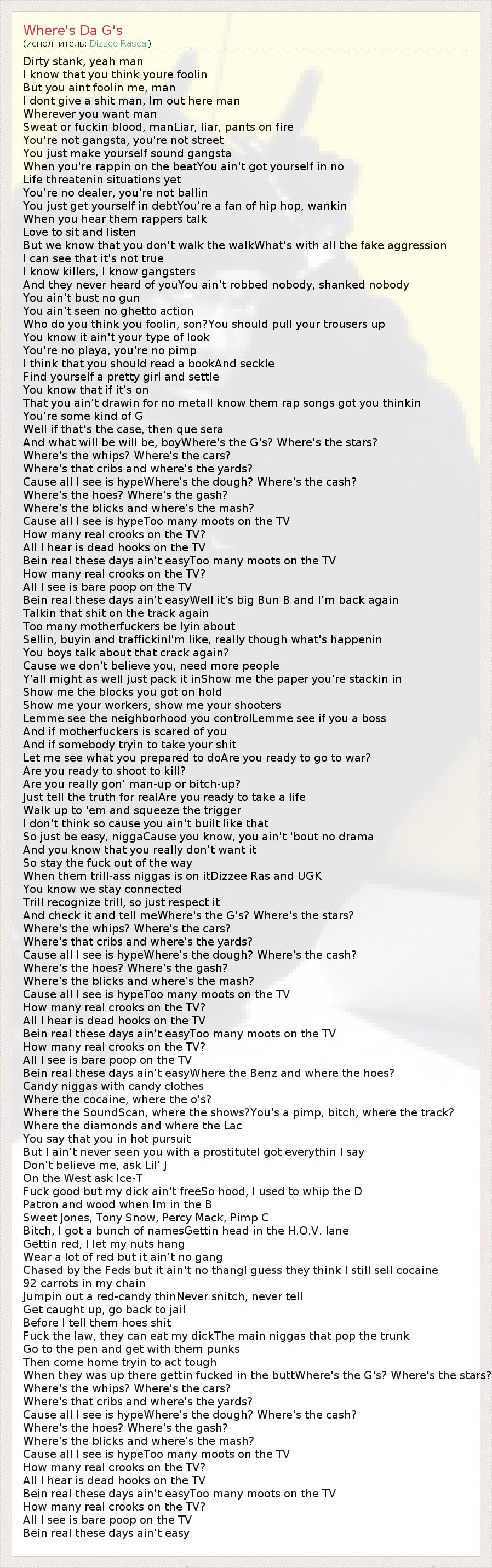 А как ты думаешь, о чем песня "Where's Da G's" ?
