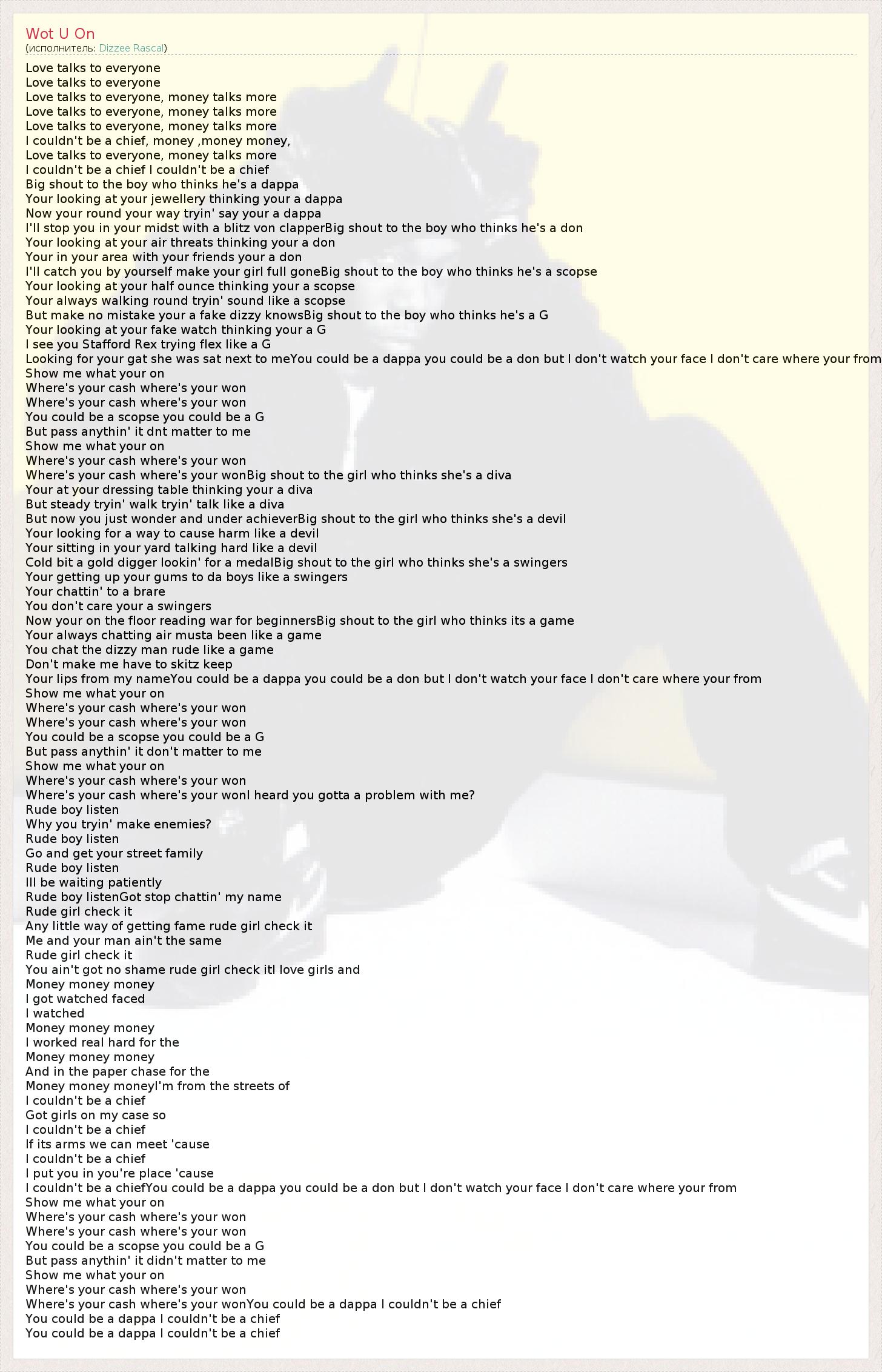 Looking for your gat she was sat next to meYou could be a dappa you could be a don but I don't watch your face I don't care where your from