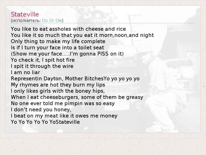 You like to eat assholes with cheese and rice You like it so much that you eat it morn,noon,and night Only thing to make my life complete Is if I turn your face into a toilet seat (Show me your face.....I'm gonna PISS on it) Yo check it, I spit hot fire I spit it through the wire I am no liar Representin Dayton, Mother BitchesYo yo yo yo yo My rhymes are hot they burn my lips I only likes girls with the boney hips, When I eat cheeseburgers, some of them be greasy No one ever told me pimpin was so easy I don't need you honey, I beat on my meat like it owes me money Yo Yo Yo Yo Yo YoStateville