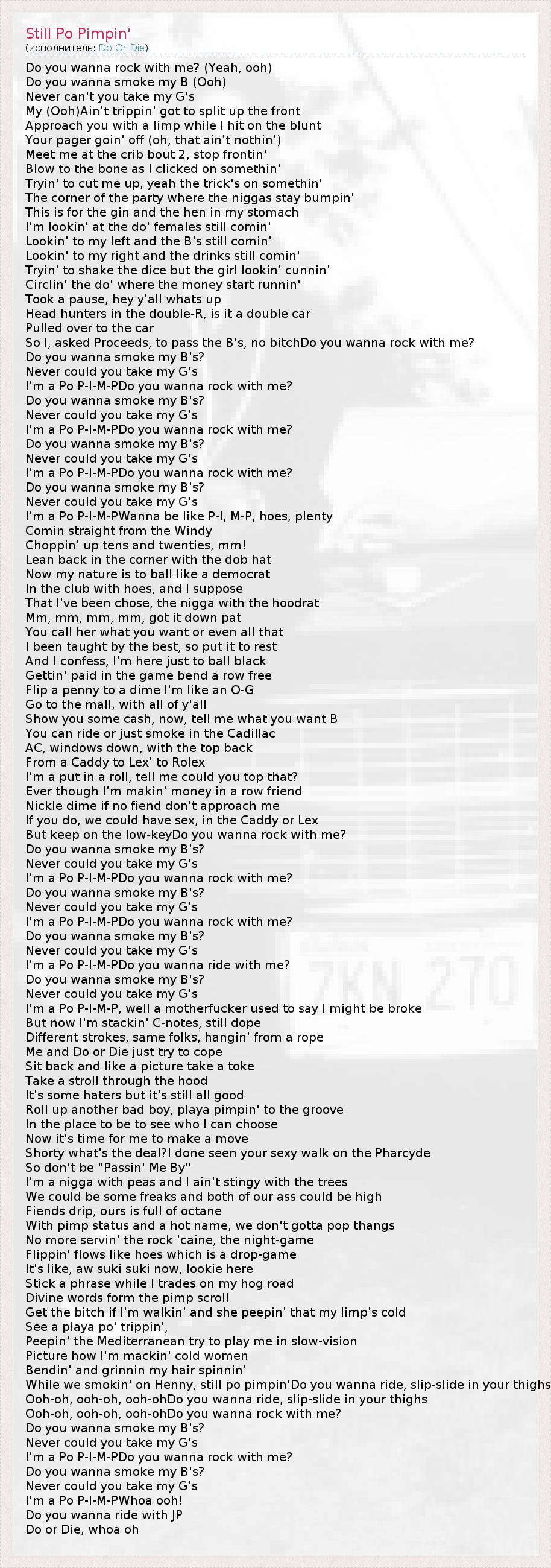 Do you wanna rock with me? (Yeah, ooh) Do you wanna smoke my B (Ooh) Never can't you take my G's My (Ooh)Ain't trippin' got to split up the front Approach you with a limp while I hit on the blunt Your pager goin' off (oh, that ain't nothin') Meet me at the crib bout 2, stop frontin' Blow to the bone as I clicked on somethin' Tryin' to cut me up, yeah the trick's on somethin' The corner of the party where the niggas stay bumpin' This is for the gin and the hen in my stomach I'm lookin' at the do' females still comin' Lookin' to my left and the B's still comin' Lookin' to my right and the drinks still comin' Tryin' to shake the dice but the girl lookin' cunnin' Circlin' the do' where the money start runnin' Took a pause, hey y'all whats up Head hunters in the double-R, is it a double car Pulled over to the car So I, asked Proceeds, to pass the B's, no bitchDo you wanna rock with me? Do you wanna smoke my B's? Never could you take my G's I'm a Po P-I-M-PDo you wanna rock with me? Do you wanna smoke my B's? Never could you take my G's I'm a Po P-I-M-PDo you wanna rock with me? Do you wanna smoke my B's? Never could you take my G's I'm a Po P-I-M-PDo you wanna rock with me? Do you wanna smoke my B's? Never could you take my G's I'm a Po P-I-M-PWanna be like P-I, M-P, hoes, plenty Comin straight from the Windy Choppin' up tens and twenties, mm! Lean back in the corner with the dob hat Now my nature is to ball like a democrat In the club with hoes, and I suppose That I've been chose, the nigga with the hoodrat Mm, mm, mm, mm, got it down pat You call her what you want or even all that I been taught by the best, so put it to rest And I confess, I'm here just to ball black Gettin' paid in the game bend a row free Flip a penny to a dime I'm like an O-G Go to the mall, with all of y'all Show you some cash, now, tell me what you want B You can ride or just smoke in the Cadillac AC, windows down, with the top back From a Caddy to Lex' to Rolex I'm a put in a roll, tell me could you top that? Ever though I'm makin' money in a row friend Nickle dime if no fiend don't approach me If you do, we could have sex, in the Caddy or Lex But keep on the low-keyDo you wanna rock with me? Do you wanna smoke my B's? Never could you take my G's I'm a Po P-I-M-PDo you wanna rock with me? Do you wanna smoke my B's? Never could you take my G's I'm a Po P-I-M-PDo you wanna rock with me? Do you wanna smoke my B's? Never could you take my G's I'm a Po P-I-M-PDo you wanna ride with me? Do you wanna smoke my B's? Never could you take my G's I'm a Po P-I-M-P, well a motherfucker used to say I might be broke But now I'm stackin' C-notes, still dope Different strokes, same folks, hangin' from a rope Me and Do or Die just try to cope Sit back and like a picture take a toke Take a stroll through the hood It's some haters but it's still all good Roll up another bad boy, playa pimpin' to the groove In the place to be to see who I can choose Now it's time for me to make a move Shorty what's the deal?I done seen your sexy walk on the Pharcyde So don't be "Passin' Me By" I'm a nigga with peas and I ain't stingy with the trees We could be some freaks and both of our ass could be high Fiends drip, ours is full of octane With pimp status and a hot name, we don't gotta pop thangs No more servin' the rock 'caine, the night-game Flippin' flows like hoes which is a drop-game It's like, aw suki suki now, lookie here Stick a phrase while I trades on my hog road Divine words form the pimp scroll Get the bitch if I'm walkin' and she peepin' that my limp's cold See a playa po' trippin', Peepin' the Mediterranean try to play me in slow-vision Picture how I'm mackin' cold women Bendin' and grinnin my hair spinnin' While we smokin' on Henny, still po pimpin'Do you wanna ride, slip-slide in your thighs Ooh-oh, ooh-oh, ooh-ohDo you wanna ride, slip-slide in your thighs Ooh-oh, ooh-oh, ooh-ohDo you wanna rock with me? Do you wanna smoke my B's? Never could you take my G's I'm a Po P-I-M-PDo you wanna rock with me? Do you wanna smoke my B's? Never could you take my G's I'm a Po P-I-M-PWhoa ooh! Do you wanna ride with JP Do or Die, whoa oh