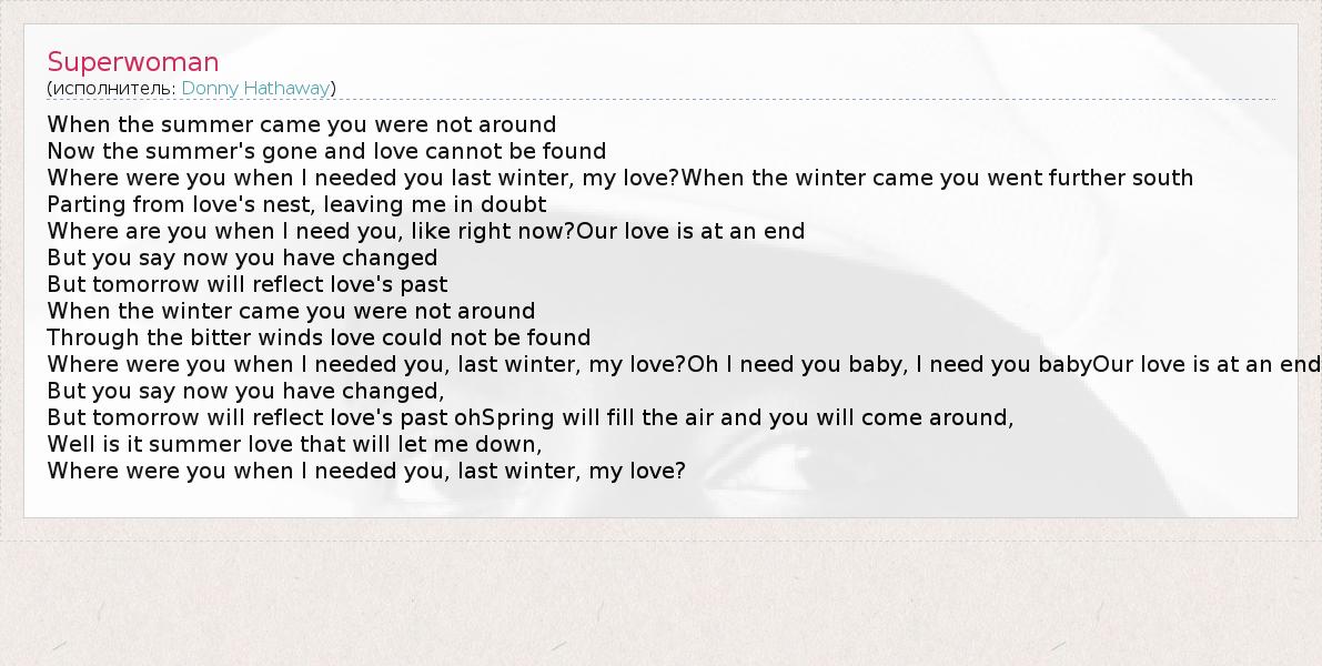 Where were you when I needed you, last winter, my love?Oh I need you baby, I need you babyOur love is at an end