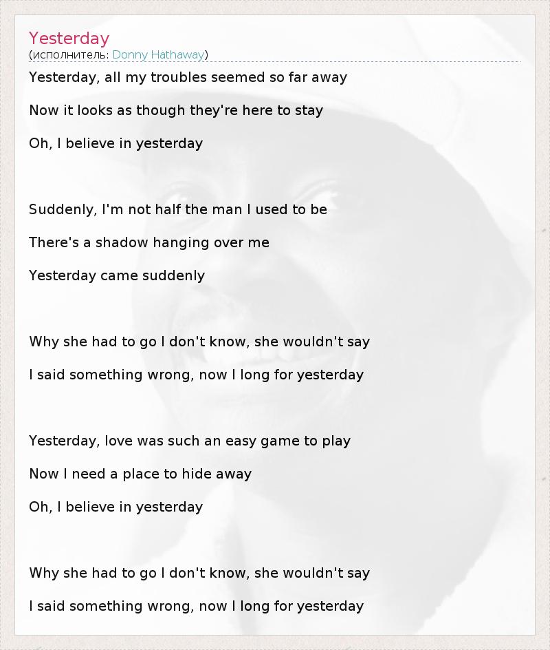 Yesterday, all my troubles seemed so far away Now it looks as though they're here to stay Oh, I believe in yesterday Suddenly, I'm not half the man I used to be There's a shadow hanging over me Yesterday came suddenly Why she had to go I don't know, she wouldn't say I said something wrong, now I long for yesterday Yesterday, love was such an easy game to play Now I need a place to hide away Oh, I believe in yesterday Why she had to go I don't know, she wouldn't say I said something wrong, now I long for yesterday
