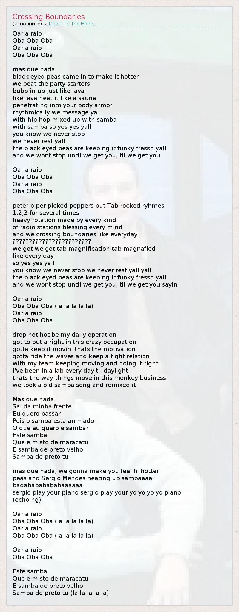 Oaria raio Oba Oba Oba Oaria raio Oba Oba Oba Больше, чем что-либо. Блэк Айд Пиз появляются, чтобы добавить жару. Мы лучше других способны разогреть публику. Мы раскалены, как лава, Да, как лава. Как воздух в душной сауне Мы проникаем к вам под кожу, Ритмично массажируя ваше тело Смесью хип-хопа с самбой. Мы никогда не остановимся, Мы не знаем покоя. Блэк Айд Пиз без конца удивляют свежими идеями и находками. Мы не остановимся, пока не завоюем ваши сердца. Oaria raio Oba Oba Oba Oaria raio Oba Oba Oba Питер Пайпер собирал перец, а Тэб писал стихи. Раз, два, три раза, несколько раз! Нас круглосуточно гоняли все Радиостанции подряд, мы стали известны, И теперь заграничные туры для нас повседневная реальность. ???????????????????? Нас восхваляют, как выпускников Кэмбриджа. Да, да, Мы никогда не остановимся, Мы не знаем покоя. Блэк Айд Пиз без конца удивляют свежими идеями и находками. Мы не остановимся, пока не завоюем ваши сердца. Oaria raio Oba Oba Oba Oaria raio Oba Oba Oba Зажигать народ – моя повседневная работа. Пора всё расставить по местам в этом безумном ремесле. Нужно только не останавливаться – вот моя мотивация. Нужно ловить волну и говорить по сути, А моя команда тем временем постоянно движется вперёд. Так держать! В студии аудиозаписи я работал до рассвета – Таковы издержки этого валяния дурака. Мы взяли старую мелодию самбы и ремиксовали её. Mas que nada Sai da minha frente Eu quero passar Pois o samba esta animado O que eu quero e sambar Este samba Que e misto de maracatu E samba de preto velho Samba de preto tu Больше, чем что-либо, мы добавим вам жару. Разогревающая самба в исполнении Пизов и Серхио Мендеса Серхио, играй свою партию на пианино, играй свою партию на пианино (звуки эха) Oaria raio Oba Oba Oba (la la la la la) Oaria raio Oba Oba Oba (la la la la la) Oaria raio Oba Oba Oba Este samba Que e misto de maracatu E samba de preto velho Samba de preto tu (la la la la la)