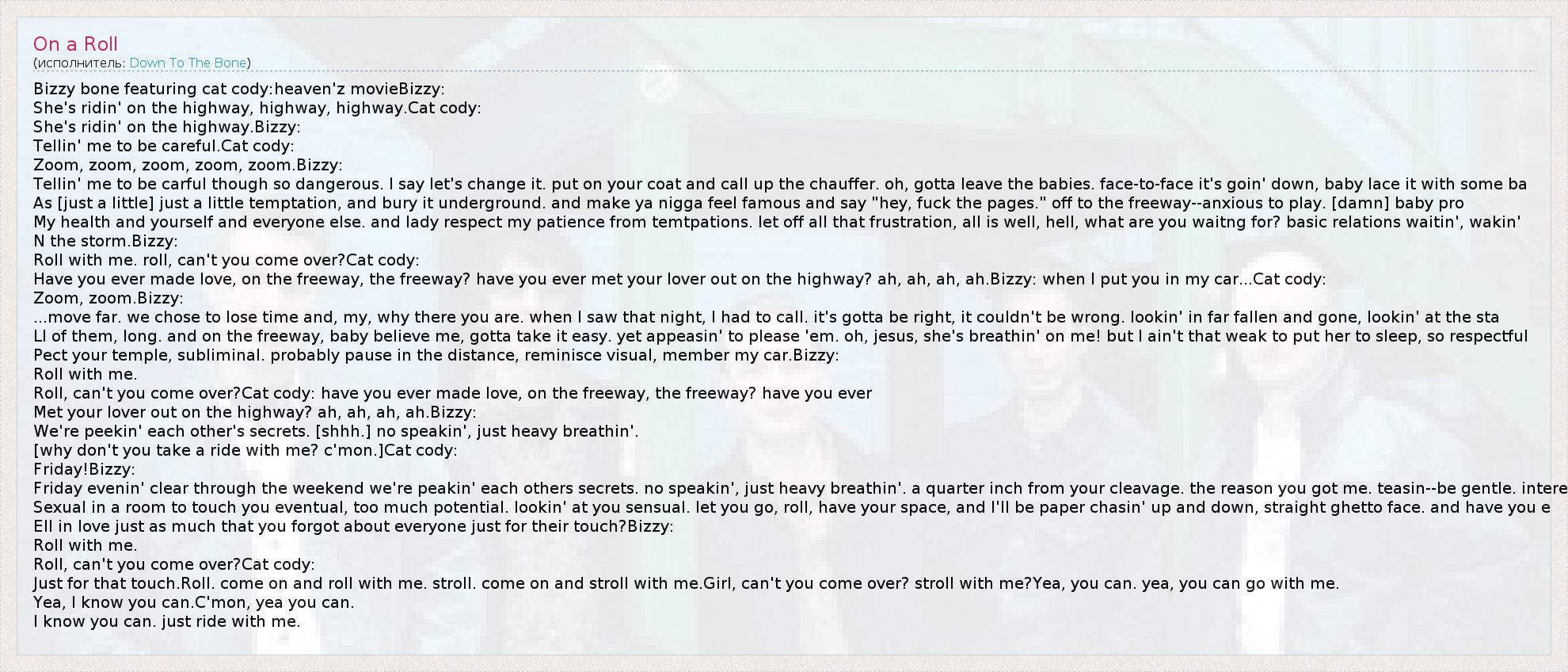 Bizzy bone featuring cat cody:heaven'z movieBizzy: She's ridin' on the highway, highway, highway.Cat cody: She's ridin' on the highway.Bizzy: Tellin' me to be careful.Cat cody: Zoom, zoom, zoom, zoom, zoom.Bizzy: Tellin' me to be carful though so dangerous. I say let's change it. put on your coat and call up the chauffer. oh, gotta leave the babies. face-to-face it's goin' down, baby lace it with some ba As [just a little] just a little temptation, and bury it underground. and make ya nigga feel famous and say "hey, fuck the pages." off to the freeway--anxious to play. [damn] baby pro My health and yourself and everyone else. and lady respect my patience from temtpations. let off all that frustration, all is well, hell, what are you waitng for? basic relations waitin', wakin' N the storm.Bizzy: Roll with me. roll, can't you come over?Cat cody: Have you ever made love, on the freeway, the freeway? have you ever met your lover out on the highway? ah, ah, ah, ah.Bizzy: when I put you in my car...Cat cody: Zoom, zoom.Bizzy: ...move far. we chose to lose time and, my, why there you are. when I saw that night, I had to call. it's gotta be right, it couldn't be wrong. lookin' in far fallen and gone, lookin' at the sta Ll of them, long. and on the freeway, baby believe me, gotta take it easy. yet appeasin' to please 'em. oh, jesus, she's breathin' on me! but I ain't that weak to put her to sleep, so respectful Pect your temple, subliminal. probably pause in the distance, reminisce visual, member my car.Bizzy: Roll with me. Roll, can't you come over?Cat cody: have you ever made love, on the freeway, the freeway? have you ever Met your lover out on the highway? ah, ah, ah, ah.Bizzy: We're peekin' each other's secrets. [shhh.] no speakin', just heavy breathin'. [why don't you take a ride with me? c'mon.]Cat cody: Friday!Bizzy: Friday evenin' clear through the weekend we're peakin' each others secrets. no speakin', just heavy breathin'. a quarter inch from your cleavage. the reason you got me. teasin--be gentle. intere Sexual in a room to touch you eventual, too much potential. lookin' at you sensual. let you go, roll, have your space, and I'll be paper chasin' up and down, straight ghetto face. and have you e Ell in love just as much that you forgot about everyone just for their touch?Bizzy: Roll with me. Roll, can't you come over?Cat cody: Just for that touch.Roll. come on and roll with me. stroll. come on and stroll with me.Girl, can't you come over? stroll with me?Yea, you can. yea, you can go with me. Yea, I know you can.C'mon, yea you can. I know you can. just ride with me.