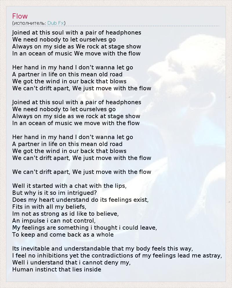 Joined at this soul with a pair of headphones We need nobody to let ourselves go Always on my side as We rock at stage show In an ocean of music We move with the flow Her hand in my hand I don't wanna let go A partner in life on this mean old road We got the wind in our back that blows We can't drift apart, We just move with the flow Joined at this soul with a pair of headphones We need nobody to let ourselves go Always on my side as we rock at stage show In an ocean of music we move with the flow Her hand in my hand I don't wanna let go A partner in life on this mean old road We got the wind in our back that blows We can't drift apart, We just move with the flow We can't drift apart, We just move with the flow Well it started with a chat with the lips, But why is it so im intrigued? Does my heart understand do its feelings exist, Fits in with all my beliefs, Im not as strong as id like to believe, An impulse i can not control, My feelings are something i thought i could leave, To keep and come back as a whole Its inevitable and understandable that my body feels this way, I feel no inhibitions yet the contradictions of my feelings lead me astray, Well i understand that i cannot deny my, Human instinct that lies inside