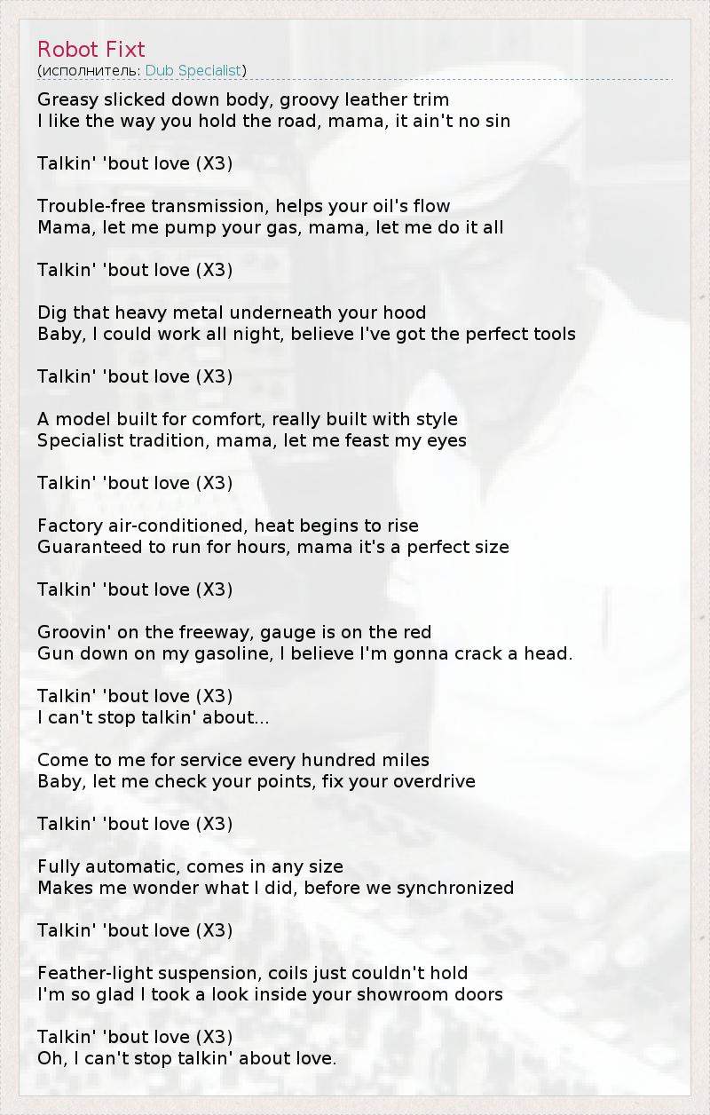 Непристойно гладкое тело внизу, привычно приведенная в порядок кожа, Мне нравится путь, которым ты идешь, мама, это совсем не грех. Говорю о любви, говорю о любви, говорю о... Надежная трансмиссия, помогает твоему маслу течь, Мама, позволь мне подкачать твой бензин, мама, позволь мне делать это всё. Говорю о любви, говорю о любви, говорю о... Копай этот тяжелый метал под своим капотом, Детка, я смогу работать всю ночь, верю, что у меня будет достаточно хорошего инструмента. Говорю о любви, говорю о любви, говорю о... Штучка состроена для комфорта, действительно состроена стильно, По специфической традиции, мама, позволь моим глазам насладиться сполна. Говорю о любви, говорю о любви, говорю о... Фирменный кондиционер, тепло начинает подниматься, Гарантировано на все часы пробега, мама, это совершенный размер. Говорю о любви, говорю о любви, говорю о... Идет по проторенной дорожке на зеленый, оценивающе выверена на красный, Врежу по газам, я верю, что я подбавлю остроты своей голове. Говорю о любви, говорю о любви, говорю о... Я не могу остановиться говорить о... Приходи ко мне для обслуживания каждые сотню миль, Детка, позволь мне проверить твои особенные точки, облегчить твой износ. Говорю о любви, говорю о любви, говорю о... Полная автоматика, подходит под любой размер, Приводит меня в восхищение то, что я сделал, до того, как мы слились воедино. Говорю о любви, говорю о любви, говорю о... Подвешенное состояние, легок как перышко, извиваюсь, только не могу удержаться, Я так рад, я взглянул внутрь за двери своего выставочного зала. Говорю о любви, говорю о любви, говорю о... О, я не могу остановиться говорить о любви.
