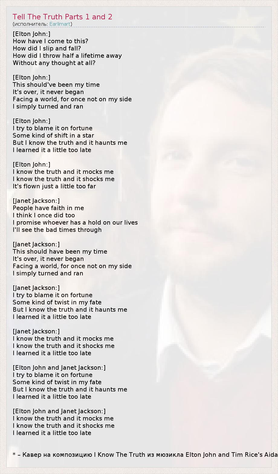[Elton John:] How have I come to this? How did I slip and fall? How did I throw half a lifetime away Without any thought at all? [Elton John:] This should've been my time It's over, it never began Facing a world, for once not on my side I simply turned and ran [Elton John:] I try to blame it on fortune Some kind of shift in a star But I know the truth and it haunts me I learned it a little too late [Elton John:] I know the truth and it mocks me I know the truth and it shocks me It's flown just a little too far [Janet Jackson:] People have faith in me I think I once did too I promise whoever has a hold on our lives I'll see the bad times through [Janet Jackson:] This should have been my time It's over, it never began Facing a world, for once not on my side I simply turned and ran [Janet Jackson:] I try to blame it on fortune Some kind of twist in my fate But I know the truth and it haunts me I learned it a little too late [Janet Jackson:] I know the truth and it mocks me I know the truth and it shocks me I learned it a little too late [Elton John and Janet Jackson:] I try to blame it on fortune Some kind of twist in my fate But I know the truth and it haunts me I learned it a little too late [Elton John and Janet Jackson:] I know the truth and it mocks me I know the truth and it shocks me I learned it a little too late * – Кавер на композицию I Know The Truth из мюзикла Elton John and Tim Rice's Aida