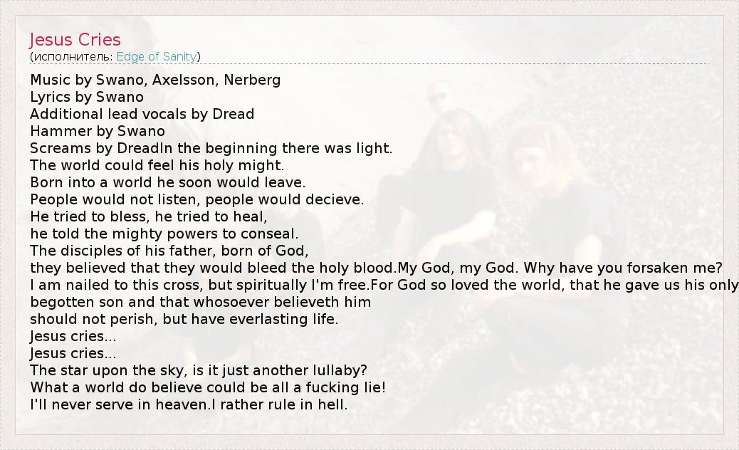 А как ты думаешь, о чем песня "Jesus Cries" ?