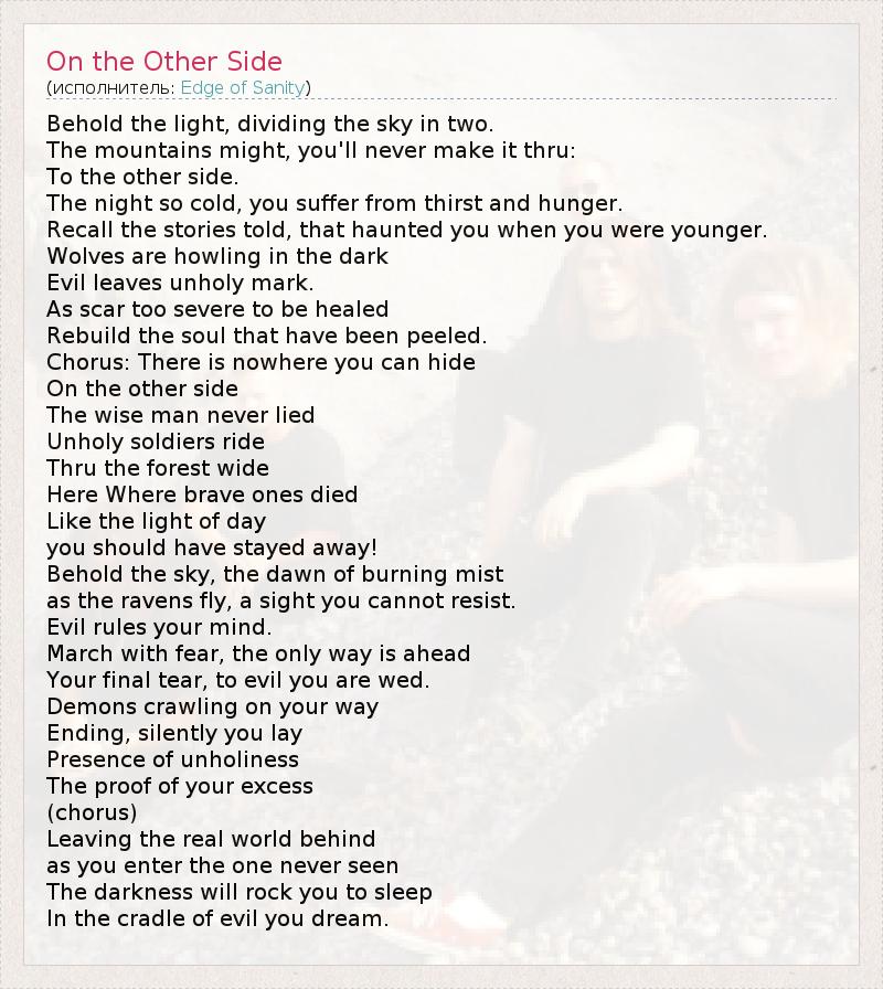 Behold the light, dividing the sky in two. The mountains might, you'll never make it thru: To the other side. The night so cold, you suffer from thirst and hunger. Recall the stories told, that haunted you when you were younger. Wolves are howling in the dark Evil leaves unholy mark. As scar too severe to be healed Rebuild the soul that have been peeled. Chorus: There is nowhere you can hide On the other side The wise man never lied Unholy soldiers ride Thru the forest wide Here Where brave ones died Like the light of day you should have stayed away! Behold the sky, the dawn of burning mist as the ravens fly, a sight you cannot resist. Evil rules your mind. March with fear, the only way is ahead Your final tear, to evil you are wed. Demons crawling on your way Ending, silently you lay Presence of unholiness The proof of your excess (chorus) Leaving the real world behind as you enter the one never seen The darkness will rock you to sleep In the cradle of evil you dream.