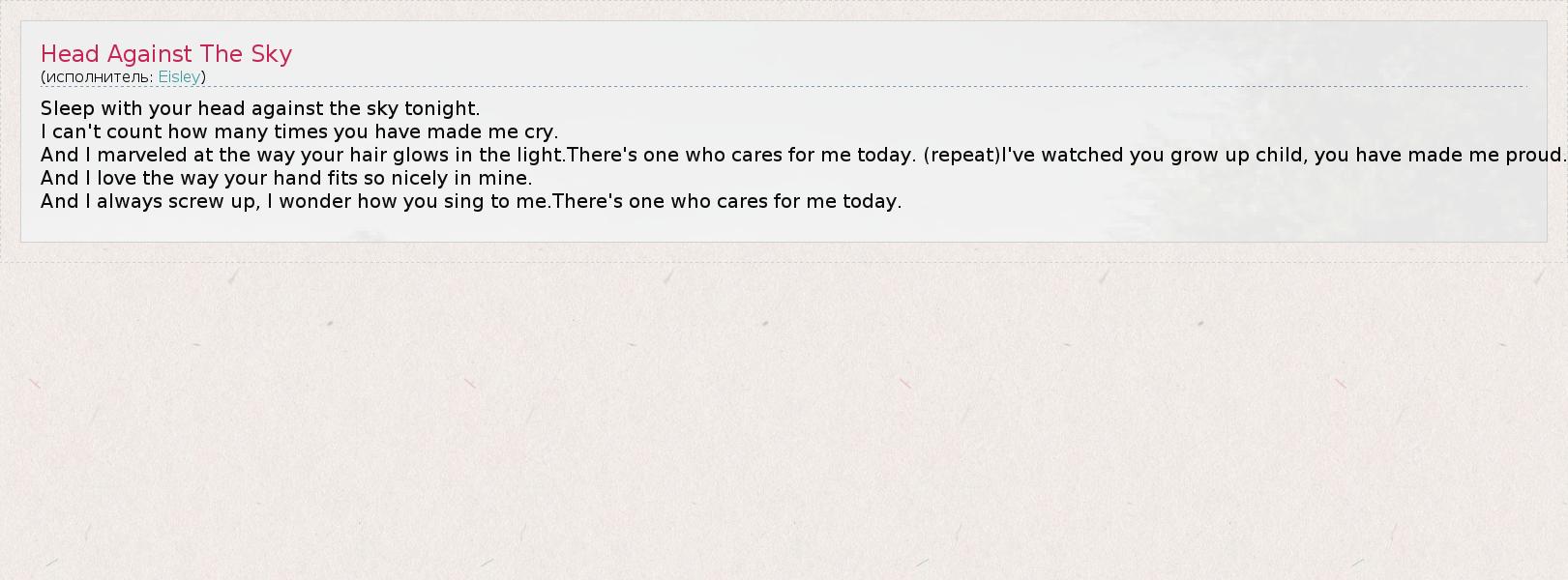 Sleep with your head against the sky tonight. I can't count how many times you have made me cry. And I marveled at the way your hair glows in the light.There's one who cares for me today. (repeat)I've watched you grow up child, you have made me proud. And I love the way your hand fits so nicely in mine. And I always screw up, I wonder how you sing to me.There's one who cares for me today.