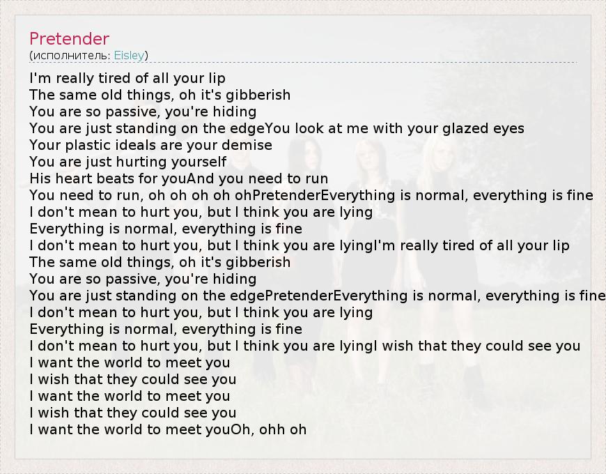 Это интересно:Eisley (Айсли) – инди-поп-рок-группа из города Тайлер, штат ТехасГруппа состоит из 5-ти участников:Шерри ДюПре - гитара, вокал; Стэйси ДюПре - клавишные, вокал; Уэстон ДюПре – ударные; Шантель ДюПре – гитара; Гэррон ДюПре – бас.Вначале, группа называлась Mos Eisley (как в Звёздных войнах), но потом, название сократили до Eisley, перед туром с Coldplay.Eisley выступали с такими группами, как Taking Back... продолжение