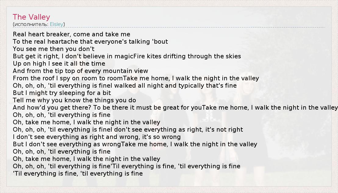 Это интересно:Eisley (Айсли) – инди-поп-рок-группа из города Тайлер, штат ТехасГруппа состоит из 5-ти участников:Шерри ДюПре - гитара, вокал; Стэйси ДюПре - клавишные, вокал; Уэстон ДюПре – ударные; Шантель ДюПре – гитара; Гэррон ДюПре – бас.Вначале, группа называлась Mos Eisley (как в Звёздных войнах), но потом, название сократили до Eisley, перед туром с Coldplay.Eisley выступали с такими группами, как Taking Back... продолжение