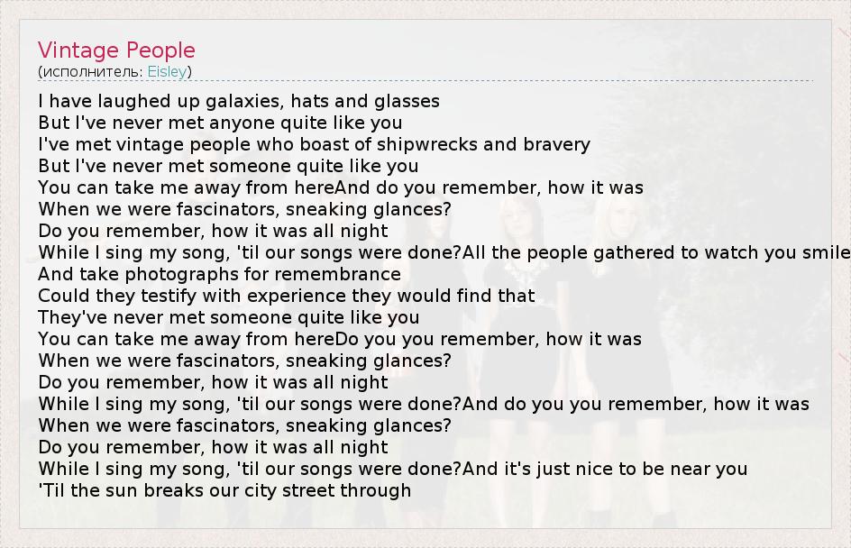 Это интересно:Eisley (Айсли) – инди-поп-рок-группа из города Тайлер, штат ТехасГруппа состоит из 5-ти участников:Шерри ДюПре - гитара, вокал; Стэйси ДюПре - клавишные, вокал; Уэстон ДюПре – ударные; Шантель ДюПре – гитара; Гэррон ДюПре – бас.Вначале, группа называлась Mos Eisley (как в Звёздных войнах), но потом, название сократили до Eisley, перед туром с Coldplay.Eisley выступали с такими группами, как Taking Back... продолжение