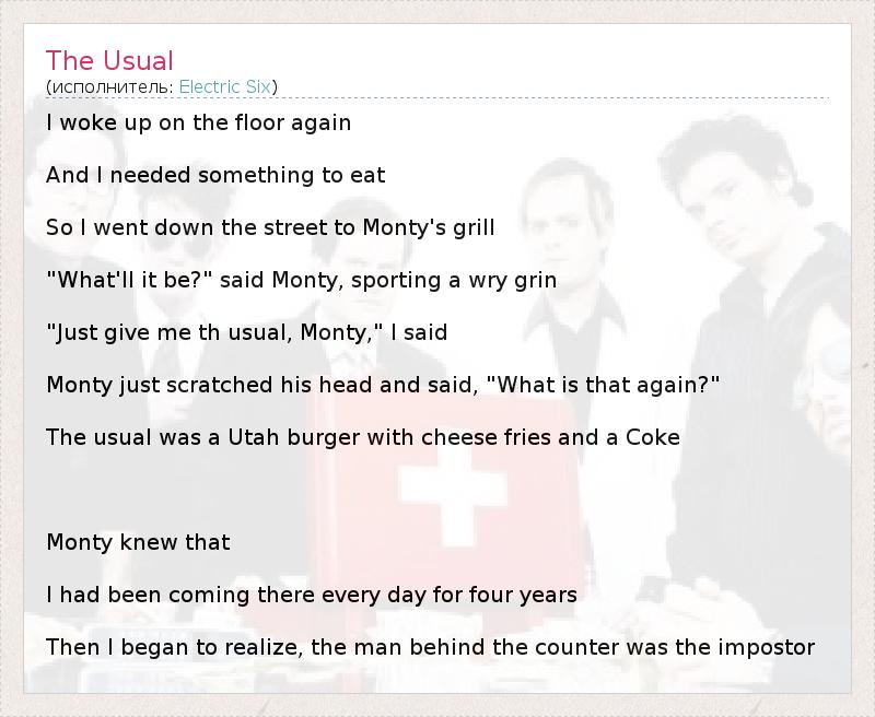 Это интересно:США, г. Детройт (Мичиган)E6 родилась в Детройте в 1996 году под именем The Wildbunch (в конечном итоге заброшенном и забытом, так как совпало с названием некоего английского (бристольского) трип-хоп-коллектива). Группа регулярно выступала в детройтских клубах «Старый Майами» и «Золотой доллар», нередко деля сцену с White Stripes. E6 первого созыва - это вокалист Дик Валентайн (Dick Valentine), гитарист Rock and... продолжение