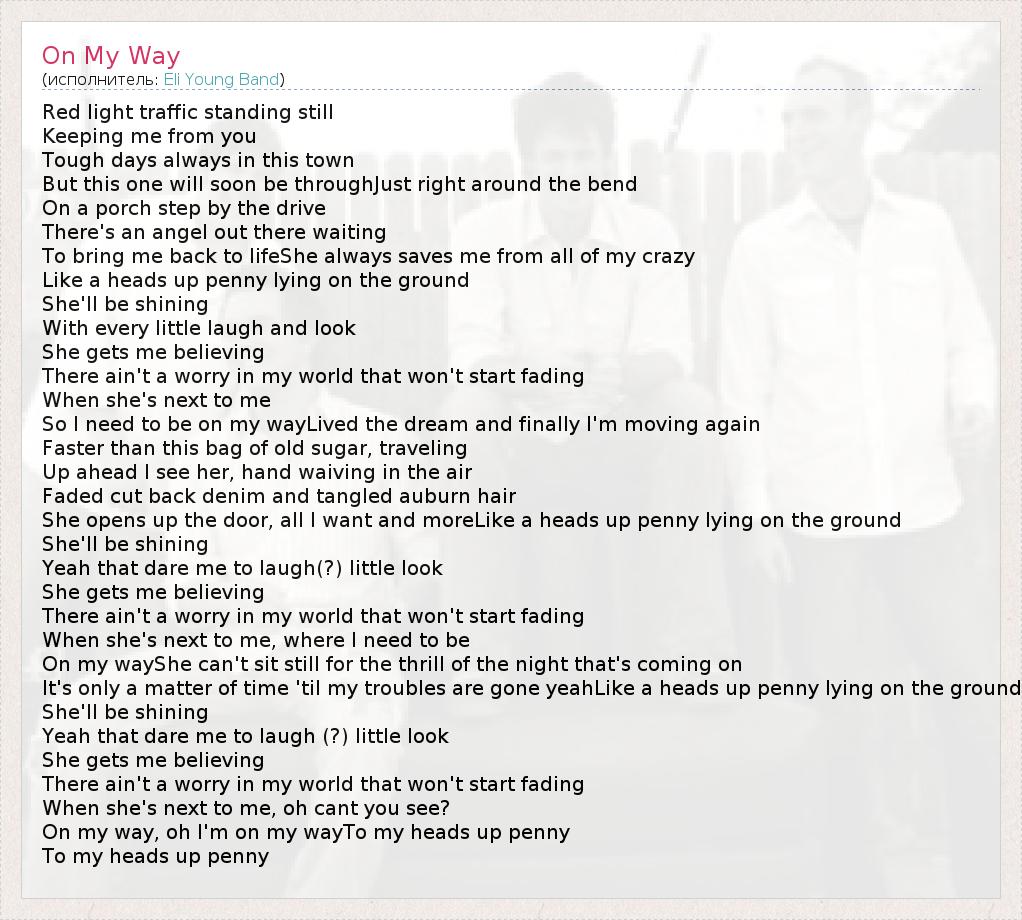 Red light traffic standing still Keeping me from you Tough days always in this town But this one will soon be throughJust right around the bend On a porch step by the drive There's an angel out there waiting To bring me back to lifeShe always saves me from all of my crazy Like a heads up penny lying on the ground She'll be shining With every little laugh and look She gets me believing There ain't a worry in my world that won't start fading When she's next to me So I need to be on my wayLived the dream and finally I'm moving again Faster than this bag of old sugar, traveling Up ahead I see her, hand waiving in the air Faded cut back denim and tangled auburn hair She opens up the door, all I want and moreLike a heads up penny lying on the ground She'll be shining Yeah that dare me to laugh(?) little look She gets me believing There ain't a worry in my world that won't start fading When she's next to me, where I need to be On my wayShe can't sit still for the thrill of the night that's coming on It's only a matter of time 'til my troubles are gone yeahLike a heads up penny lying on the ground She'll be shining Yeah that dare me to laugh (?) little look She gets me believing There ain't a worry in my world that won't start fading When she's next to me, oh cant you see? On my way, oh I'm on my wayTo my heads up penny To my heads up penny