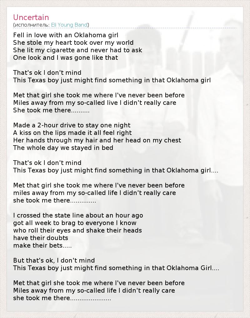 Fell in love with an Oklahoma girl She stole my heart took over my world She lit my cigarette and never had to ask One look and I was gone like that That's ok I don't mind This Texas boy just might find something in that Oklahoma girl Met that girl she took me where I've never been before Miles away from my so-called live I didn't really care She took me there.......... Made a 2-hour drive to stay one night A kiss on the lips made it all feel right Her hands through my hair and her head on my chest The whole day we stayed in bed That's ok I don't mind This Texas boy just might find something in that Oklahoma girl.... Met that girl she took me where I've never been before miles away from my so-called life I didn't really care she took me there.............. I crossed the state line about an hour ago got all week to brag to everyone I know who roll their eyes and shake their heads have their doubts make their bets..... But that's ok, I don't mind This Texas boy just might find something in that Oklahoma Girl.... Met that girl she took me where I've never been before Miles away from my so-called life I didn't really care she took me there......................