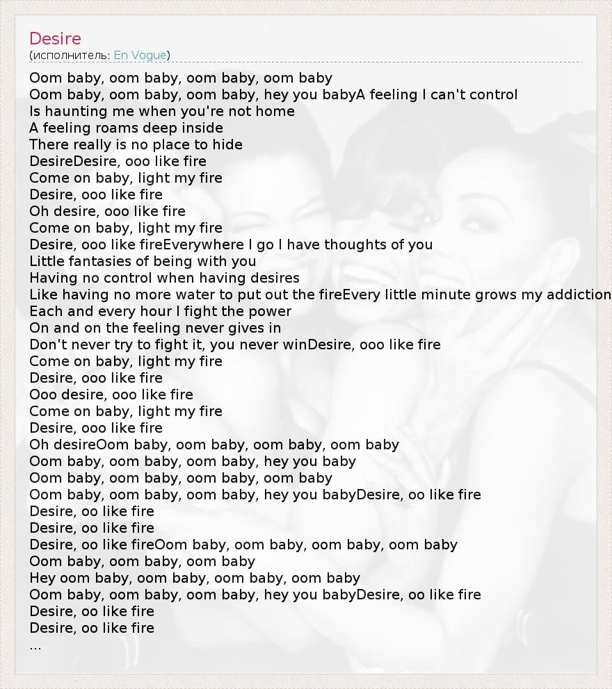 Oom baby, oom baby, oom baby, oom baby Oom baby, oom baby, oom baby, hey you babyA feeling I can't control Is haunting me when you're not home A feeling roams deep inside There really is no place to hide DesireDesire, ooo like fire Come on baby, light my fire Desire, ooo like fire Oh desire, ooo like fire Come on baby, light my fire Desire, ooo like fireEverywhere I go I have thoughts of you Little fantasies of being with you Having no control when having desires Like having no more water to put out the fireEvery little minute grows my addiction Each and every hour I fight the power On and on the feeling never gives in Don't never try to fight it, you never winDesire, ooo like fire Come on baby, light my fire Desire, ooo like fire Ooo desire, ooo like fire Come on baby, light my fire Desire, ooo like fire Oh desireOom baby, oom baby, oom baby, oom baby Oom baby, oom baby, oom baby, hey you baby Oom baby, oom baby, oom baby, oom baby Oom baby, oom baby, oom baby, hey you babyDesire, oo like fire Desire, oo like fire Desire, oo like fire Desire, oo like fireOom baby, oom baby, oom baby, oom baby Oom baby, oom baby, oom baby Hey oom baby, oom baby, oom baby, oom baby Oom baby, oom baby, oom baby, hey you babyDesire, oo like fire Desire, oo like fire Desire, oo like fire ...