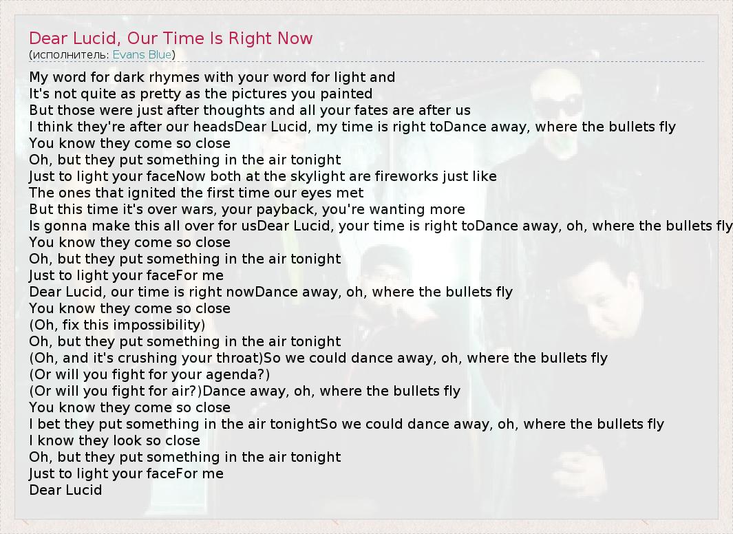 ГлавнаяИсполнителиEvans BlueDear Lucid, Our Time Is Right Now