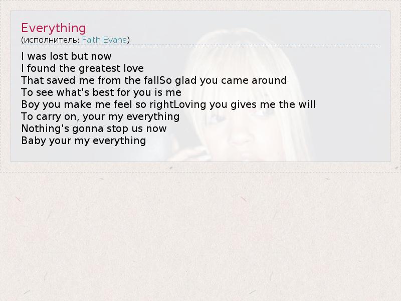 I was lost but now I found the greatest love That saved me from the fallSo glad you came around To see what's best for you is me Boy you make me feel so rightLoving you gives me the will To carry on, your my everything Nothing's gonna stop us now Baby your my everything