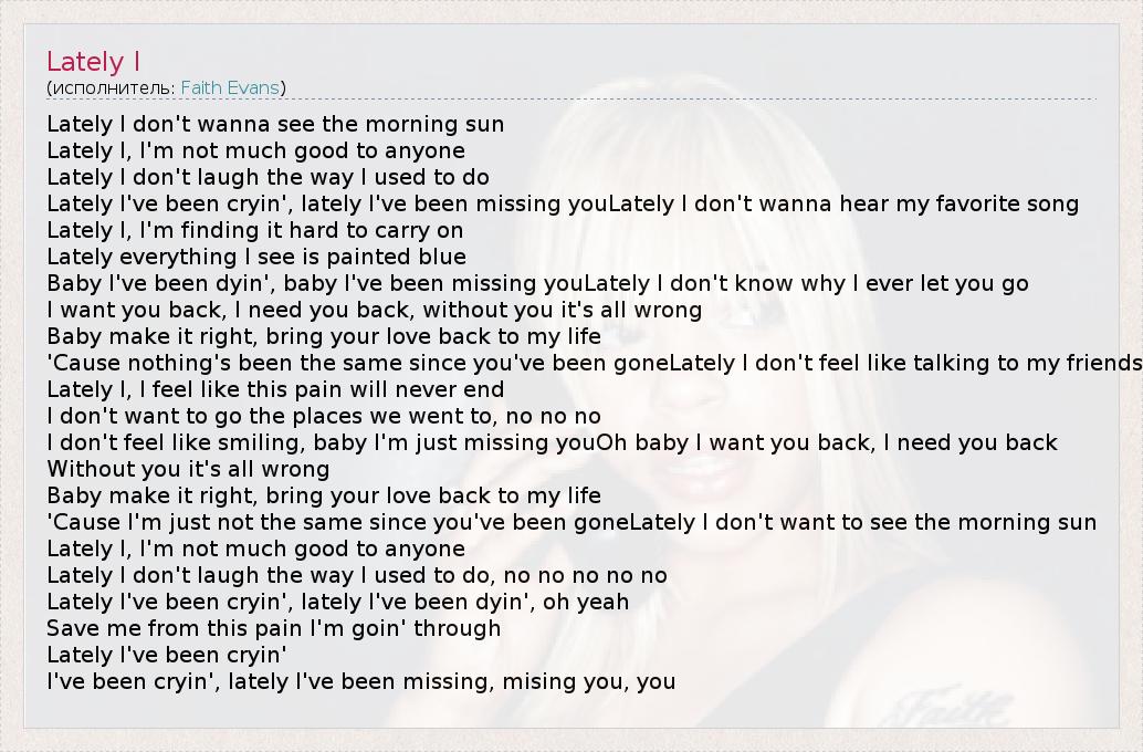 Lately I don't wanna see the morning sun Lately I, I'm not much good to anyone Lately I don't laugh the way I used to do Lately I've been cryin', lately I've been missing youLately I don't wanna hear my favorite song Lately I, I'm finding it hard to carry on Lately everything I see is painted blue Baby I've been dyin', baby I've been missing youLately I don't know why I ever let you go I want you back, I need you back, without you it's all wrong Baby make it right, bring your love back to my life 'Cause nothing's been the same since you've been goneLately I don't feel like talking to my friends Lately I, I feel like this pain will never end I don't want to go the places we went to, no no no I don't feel like smiling, baby I'm just missing youOh baby I want you back, I need you back Without you it's all wrong Baby make it right, bring your love back to my life 'Cause I'm just not the same since you've been goneLately I don't want to see the morning sun Lately I, I'm not much good to anyone Lately I don't laugh the way I used to do, no no no no no Lately I've been cryin', lately I've been dyin', oh yeah Save me from this pain I'm goin' through Lately I've been cryin' I've been cryin', lately I've been missing, mising you, you