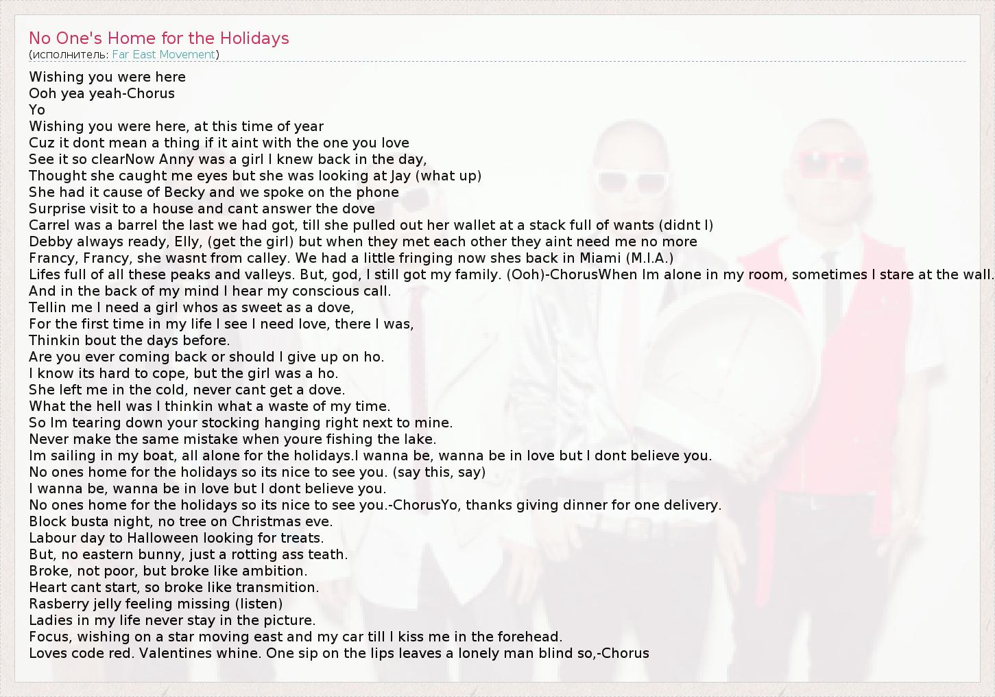Wishing you were here Ooh yea yeah-Chorus Yo Wishing you were here, at this time of year Cuz it dont mean a thing if it aint with the one you love See it so clearNow Anny was a girl I knew back in the day, Thought she caught me eyes but she was looking at Jay (what up) She had it cause of Becky and we spoke on the phone Surprise visit to a house and cant answer the dove Carrel was a barrel the last we had got, till she pulled out her wallet at a stack full of wants (didnt I) Debby always ready, Elly, (get the girl) but when they met each other they aint need me no more Francy, Francy, she wasnt from calley. We had a little fringing now shes back in Miami (M.I.A.) Lifes full of all these peaks and valleys. But, god, I still got my family. (Ooh)-ChorusWhen Im alone in my room, sometimes I stare at the wall. And in the back of my mind I hear my conscious call. Tellin me I need a girl whos as sweet as a dove, For the first time in my life I see I need love, there I was, Thinkin bout the days before. Are you ever coming back or should I give up on ho. I know its hard to cope, but the girl was a ho. She left me in the cold, never cant get a dove. What the hell was I thinkin what a waste of my time. So Im tearing down your stocking hanging right next to mine. Never make the same mistake when youre fishing the lake. Im sailing in my boat, all alone for the holidays.I wanna be, wanna be in love but I dont believe you. No ones home for the holidays so its nice to see you. (say this, say) I wanna be, wanna be in love but I dont believe you. No ones home for the holidays so its nice to see you.-ChorusYo, thanks giving dinner for one delivery. Block busta night, no tree on Christmas eve. Labour day to Halloween looking for treats. But, no eastern bunny, just a rotting ass teath. Broke, not poor, but broke like ambition. Heart cant start, so broke like transmition. Rasberry jelly feeling missing (listen) Ladies in my life never stay in the picture. Focus, wishing on a star moving east and my car till I kiss me in the forehead. Loves code red. Valentines whine. One sip on the lips leaves a lonely man blind so,-Chorus