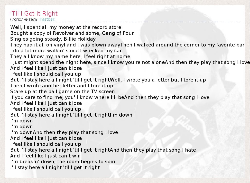 Well, I spent all my money at the record store Bought a copy of Revolver and some, Gang of Four Singles going steady, Billie Holiday They had it all on vinyl and I was blown awayThen I walked around the corner to my favorite bar I do a lot more walkin' since I wrecked my car They all know my name here, I feel right at home I just might spend the night here, since I know you're not aloneAnd then they play that song I love And I feel like I just can't lose I feel like I should call you up But I'll stay here all night 'til I get it rightWell, I wrote you a letter but I tore it up Then I wrote another letter and I tore it up Stare up at the ball game on the TV screen If you care to find me, you'll know where I'll beAnd then they play that song I love And I feel like I just can't lose I feel like I should call you up But I'll stay here all night 'til I get it rightI'm down I'm down I'm down I'm downAnd then they play that song I love And I feel like I just can't lose I feel like I should call you up But I'll stay here all night 'til I get it rightAnd then they play that song I hate And I feel like I just can't win I'm breakin' down, the room begins to spin I'll stay here all night 'til I get it right