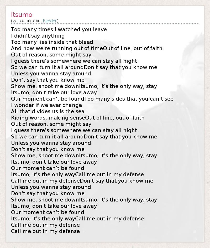 Это интересно:Feeder - бритрок-группа из Южного Уэльса. Образована в 1995 году двумя старыми друзьями - вокалистом Грантом Николасом и ударником Джоном Ли. Чуть позже к группе примкнул Така Хиросе, японец по происхождению. После выпуска двух демо-альбомов Two Colours (1995) и Swim (1996) ребята приглянулись лейблу Echo Records. Подписав контракт с Echo, Feeder стали записывать дебютный альбом Polythene. Не сказать, что слишком удачный,... продолжение
