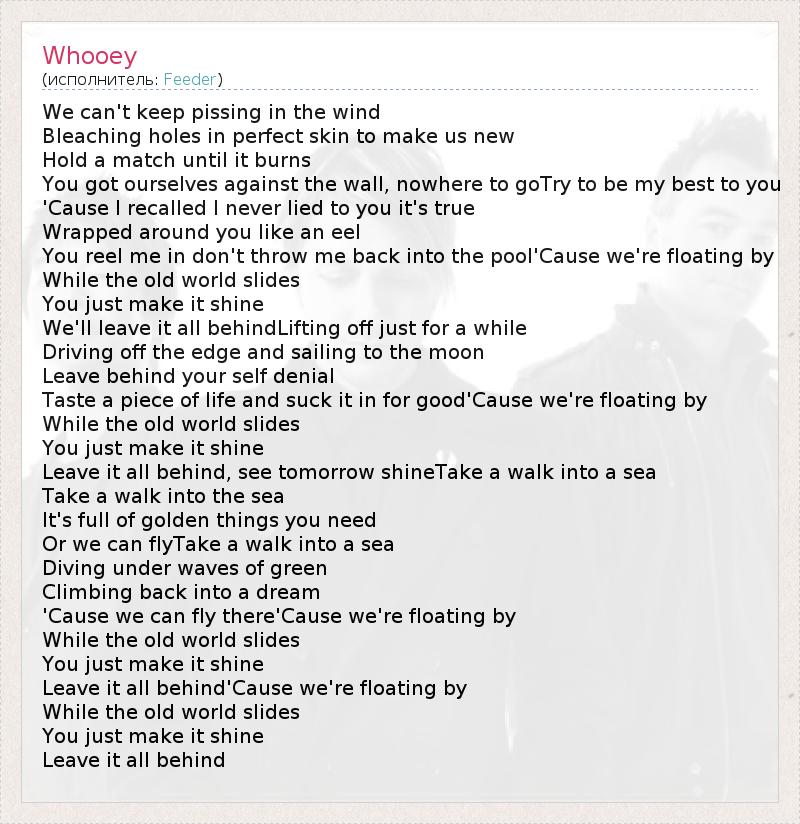 Это интересно:Feeder - бритрок-группа из Южного Уэльса. Образована в 1995 году двумя старыми друзьями - вокалистом Грантом Николасом и ударником Джоном Ли. Чуть позже к группе примкнул Така Хиросе, японец по происхождению. После выпуска двух демо-альбомов Two Colours (1995) и Swim (1996) ребята приглянулись лейблу Echo Records. Подписав контракт с Echo, Feeder стали записывать дебютный альбом Polythene. Не сказать, что слишком удачный,... продолжение