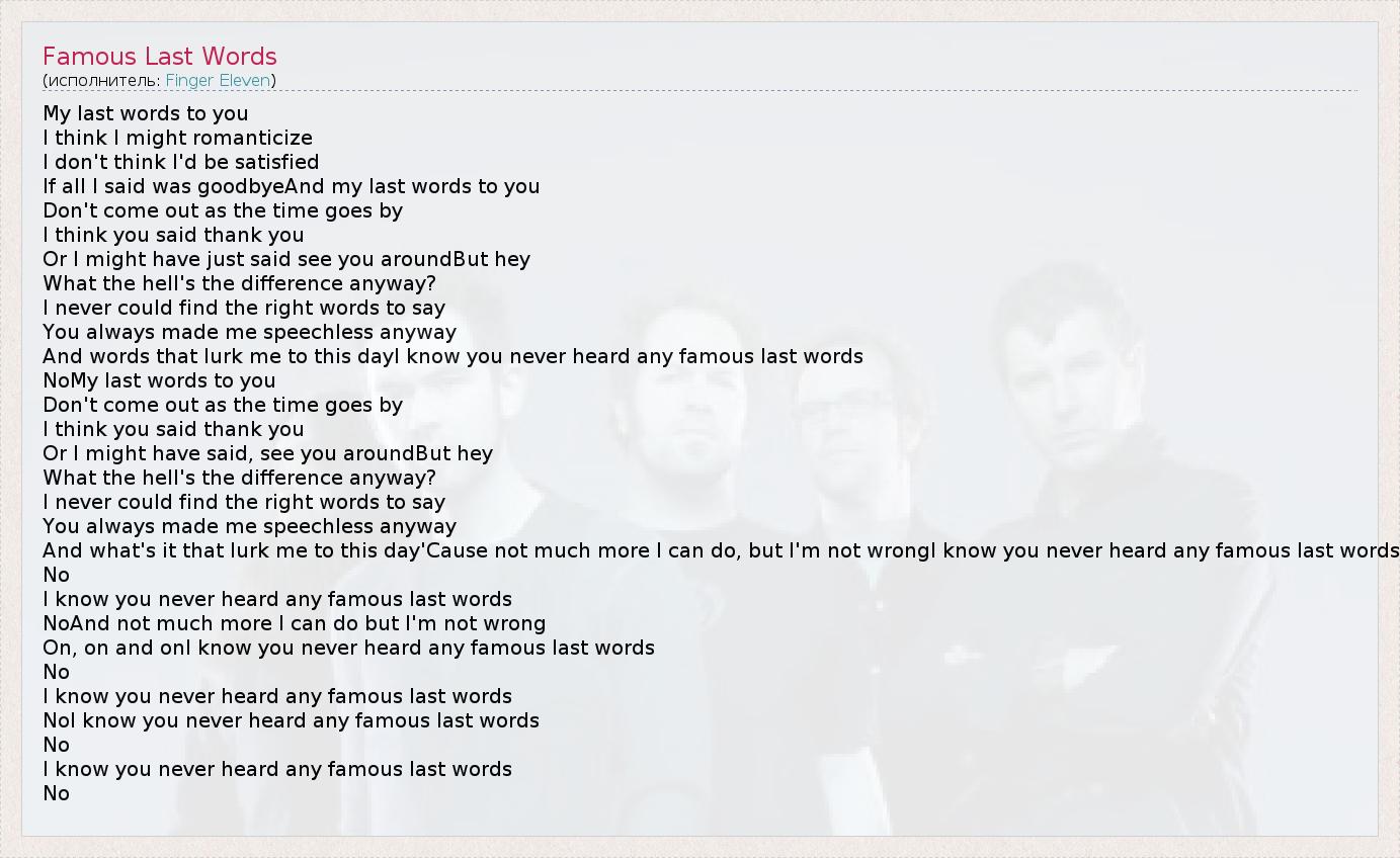 My last words to you I think I might romanticize I don't think I'd be satisfied If all I said was goodbyeAnd my last words to you Don't come out as the time goes by I think you said thank you Or I might have just said see you aroundBut hey What the hell's the difference anyway? I never could find the right words to say You always made me speechless anyway And words that lurk me to this dayI know you never heard any famous last words NoMy last words to you Don't come out as the time goes by I think you said thank you Or I might have said, see you aroundBut hey What the hell's the difference anyway? I never could find the right words to say You always made me speechless anyway And what's it that lurk me to this day'Cause not much more I can do, but I'm not wrongI know you never heard any famous last words No I know you never heard any famous last words NoAnd not much more I can do but I'm not wrong On, on and onI know you never heard any famous last words No I know you never heard any famous last words NoI know you never heard any famous last words No I know you never heard any famous last words No